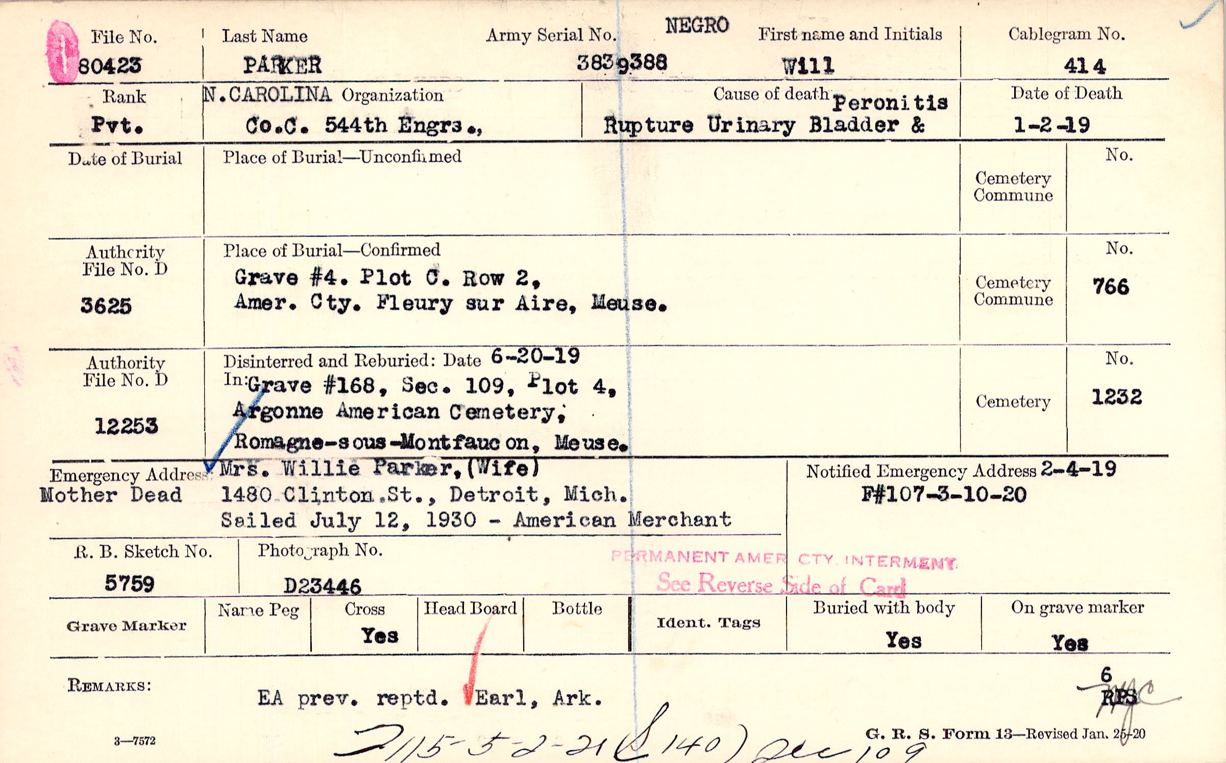 Mrs. Willie Parker, (Wife), 1480 Clinton. St., Detroit, Mich., Sailed July 12, 1930 -- American Merchant