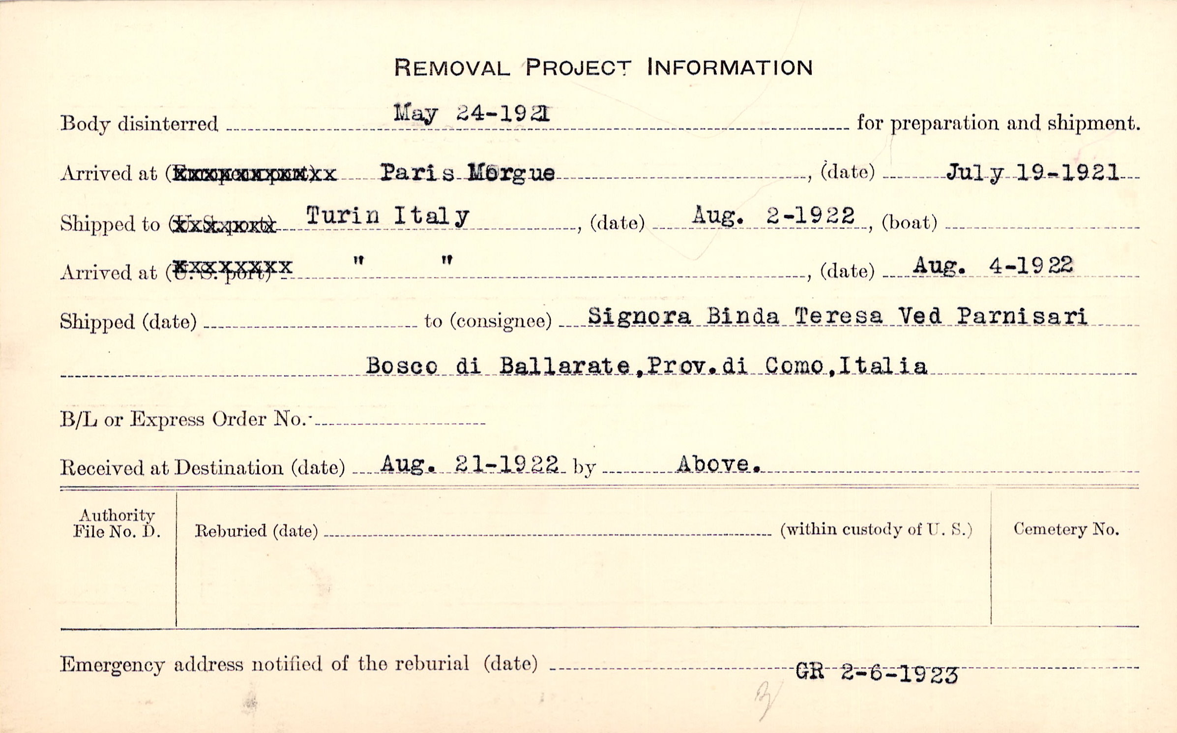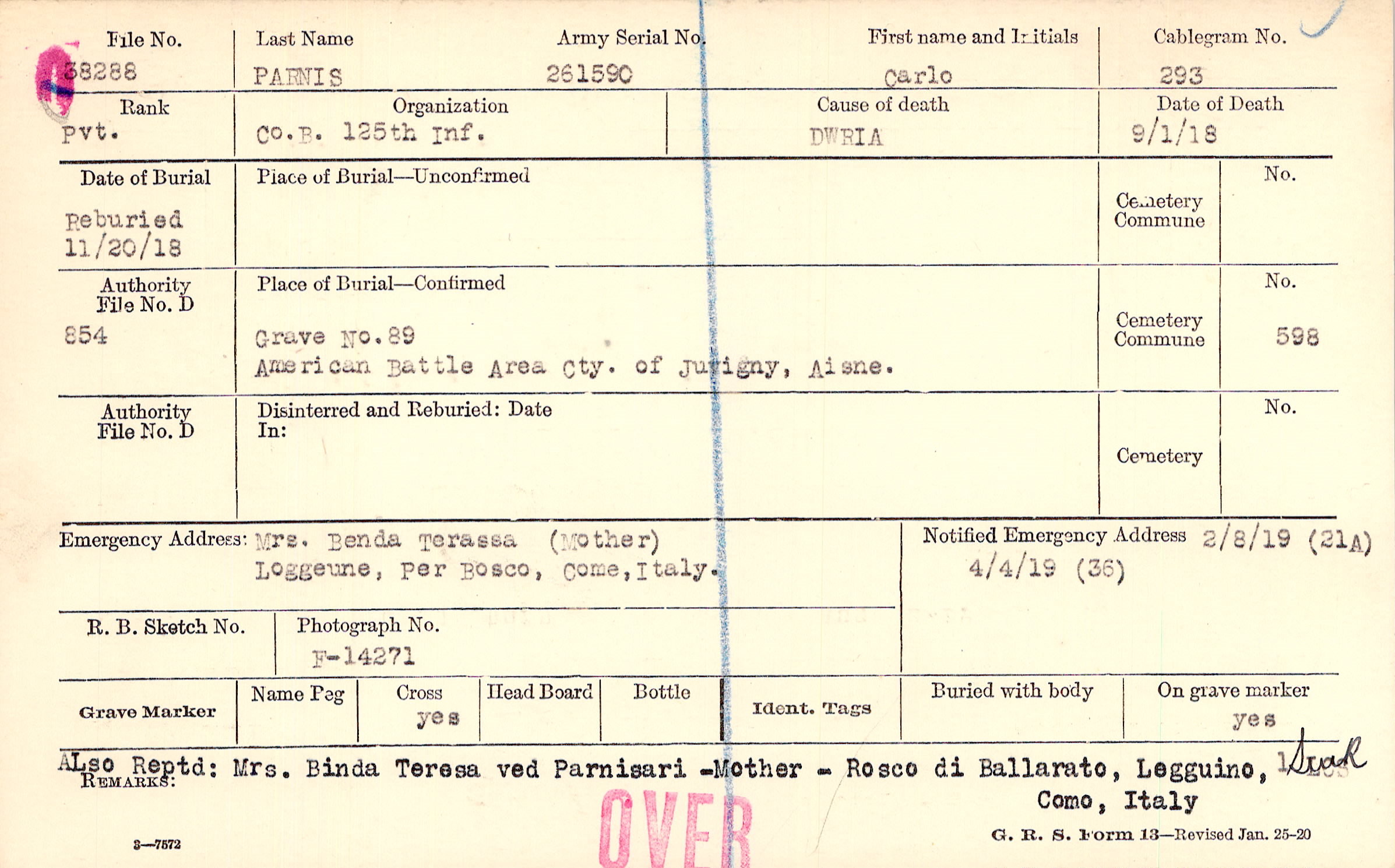 ALso Reptd: Mrs. Binda Teresa ved Parnisari - Mother - Rosco di Ballarato, Legguino, Como, Italy