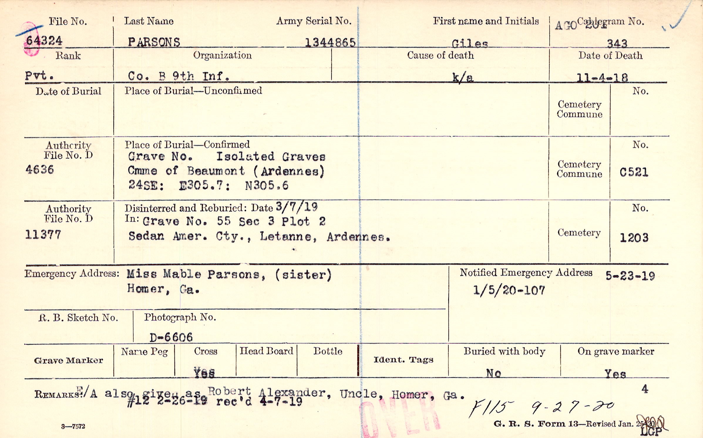 E/A also given as Robert Alexander, Uncle, Homer, Ga., #12 2-26-19 rec`d 4-7-19, F115 9-27-20