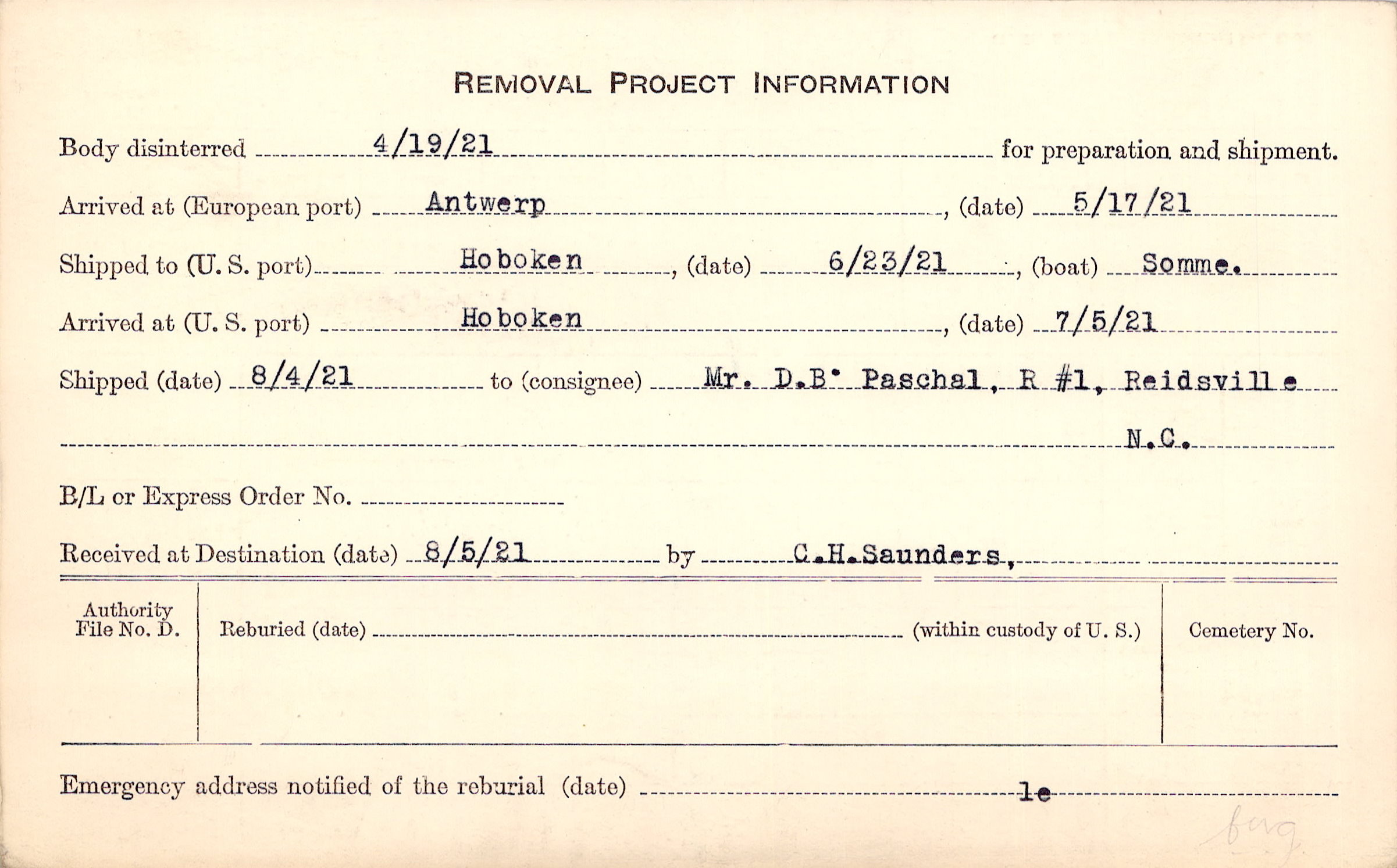 Body disinterred 4/19/1921 for preparation and shipment.