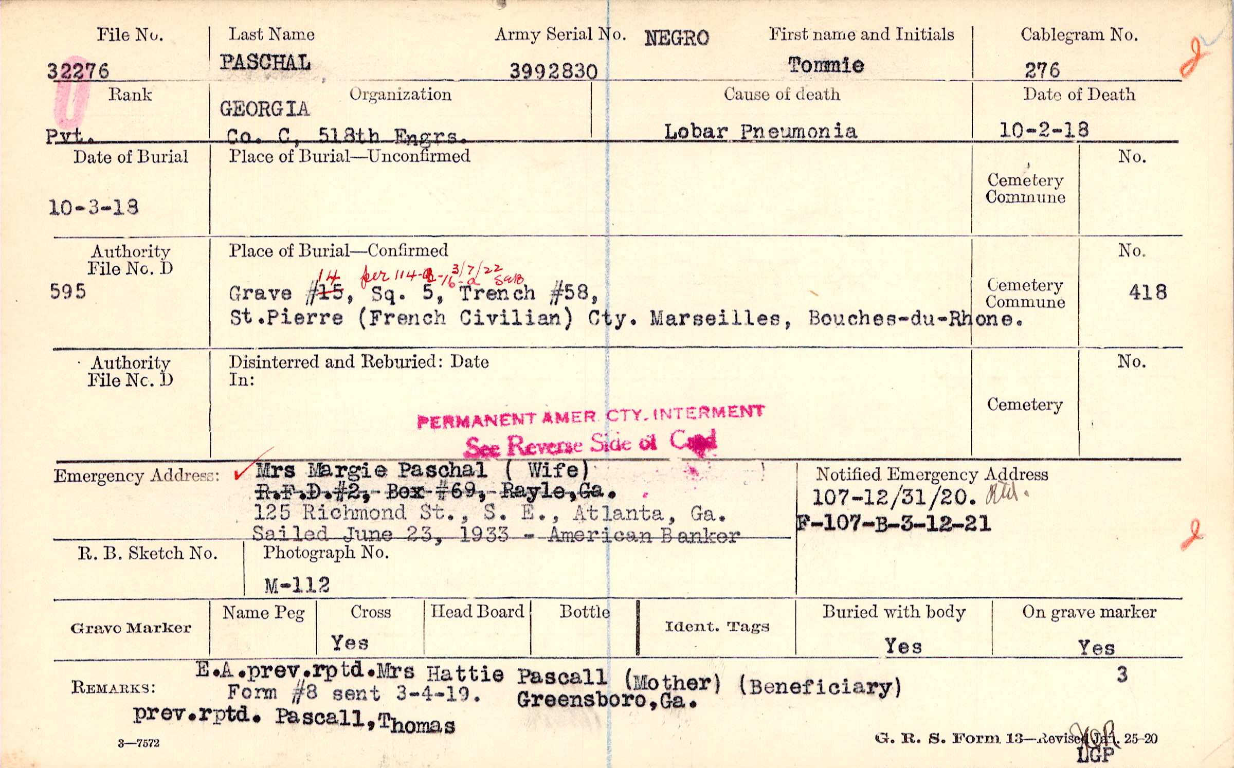 Grave #14, Sq. 5, Trench #58, St.Pierre (French Civilian) Cty., Marseilles, Bouches-du-Rhone.