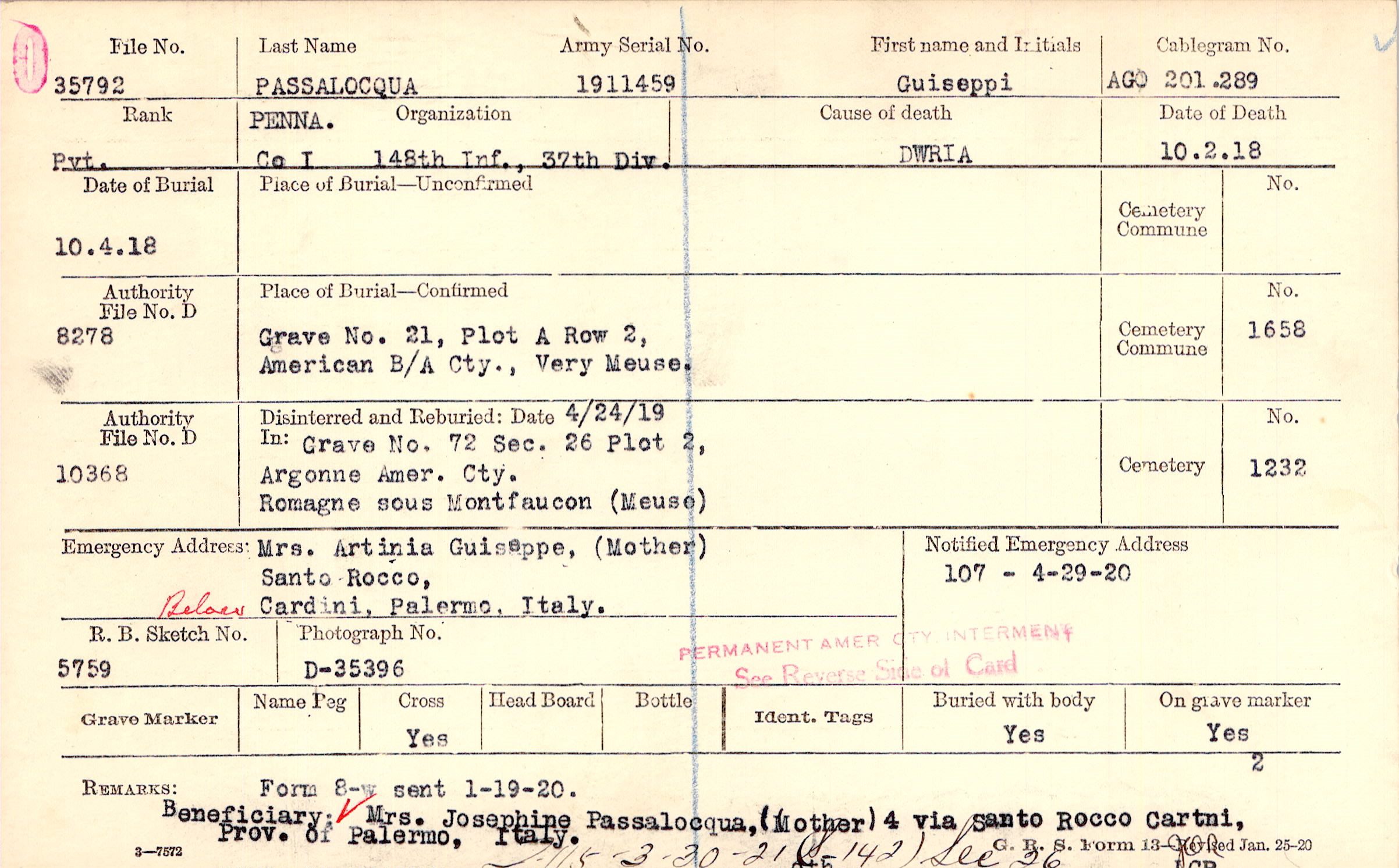 Mrs. Artinia Guiseppe, (Mother), Santo Rocco, Cardini, Palmero, Italy., Below