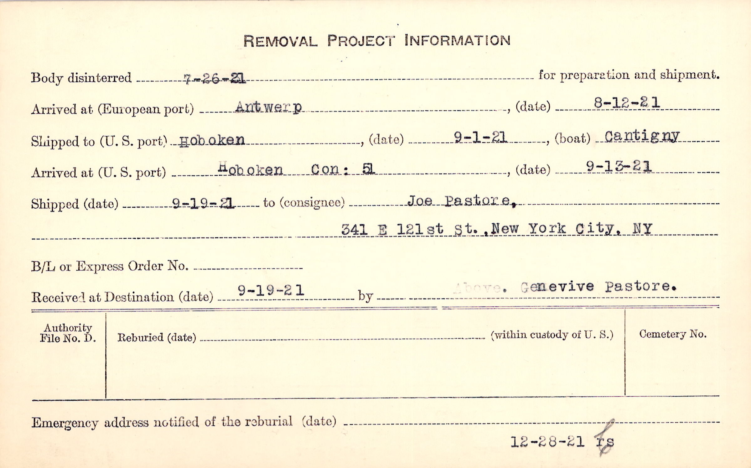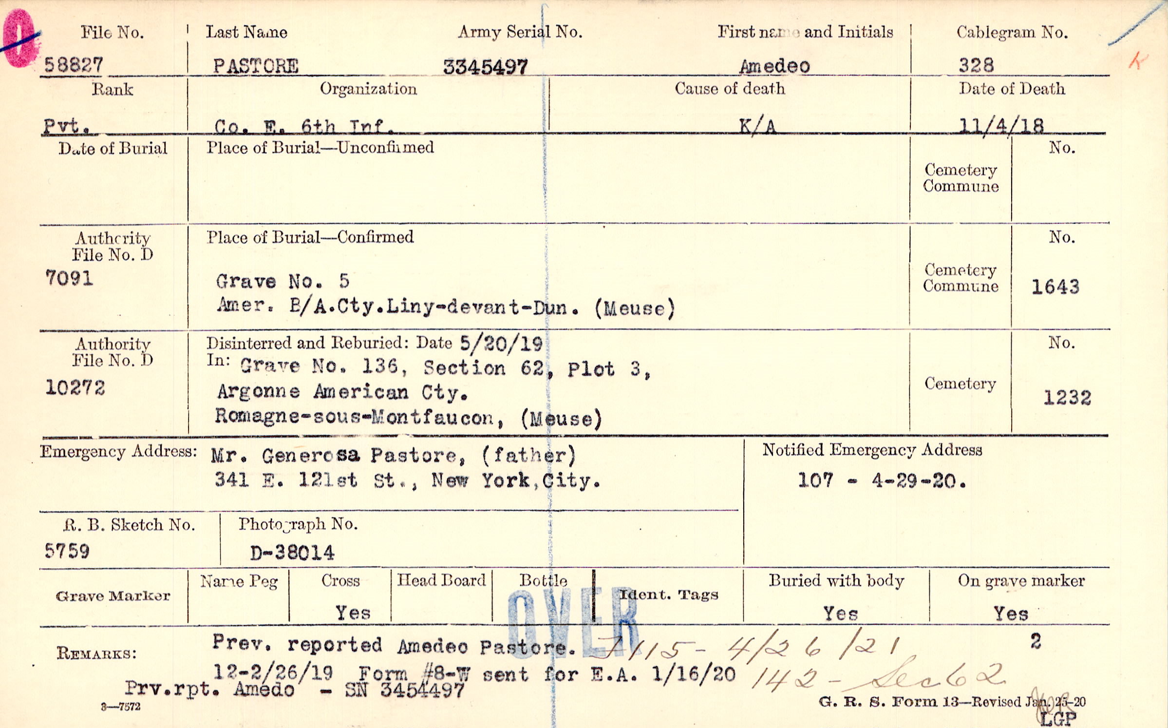 Mr. Generosa Pastore, (father), 341 E. 121st St., New York, City.