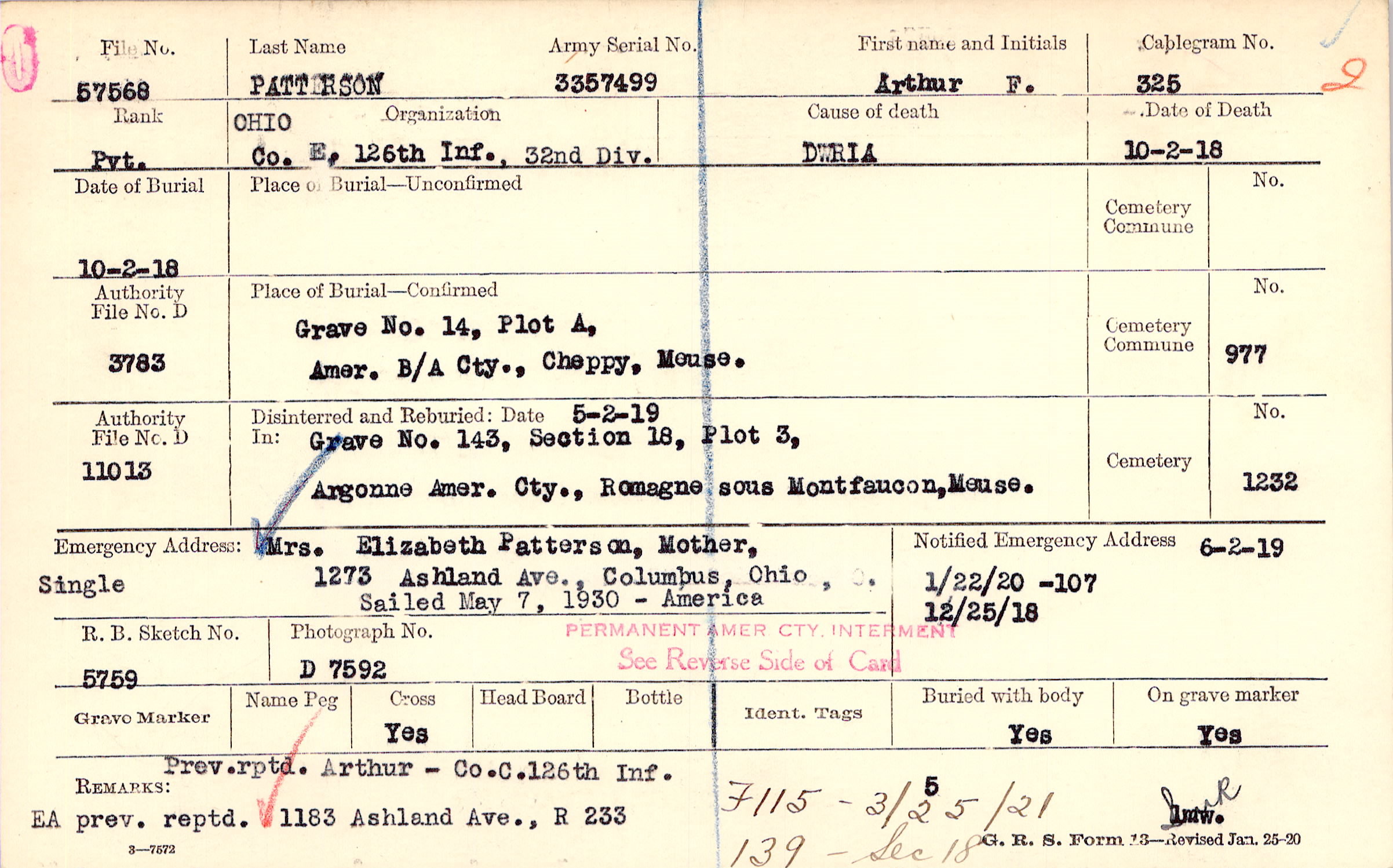 Prev. rptd. Arthur - Co. C. 126th Inf. EA prev. rptd. 1183 Ashland Ave., R 233, F115 - 3/25/21 139 - Sec 18