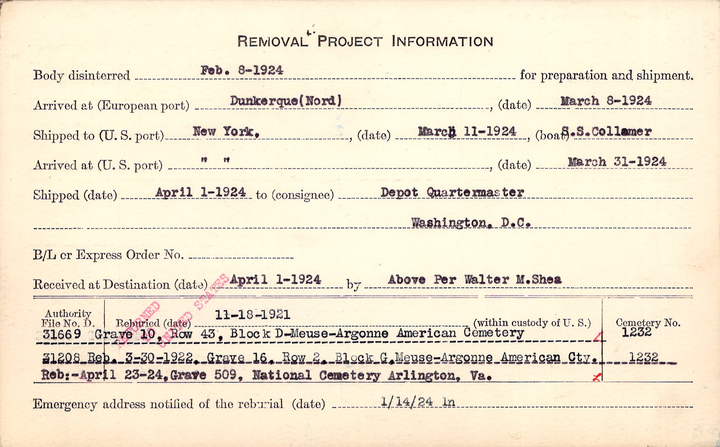 Body disinterred 2/8/1924 for preparation and shipment.