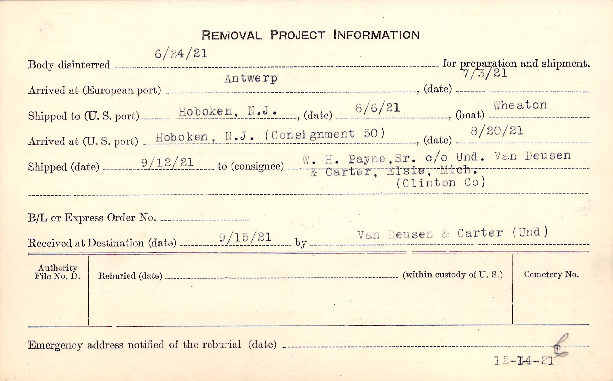 Body disinterred 6/24/1921 for preparation and shipment.
