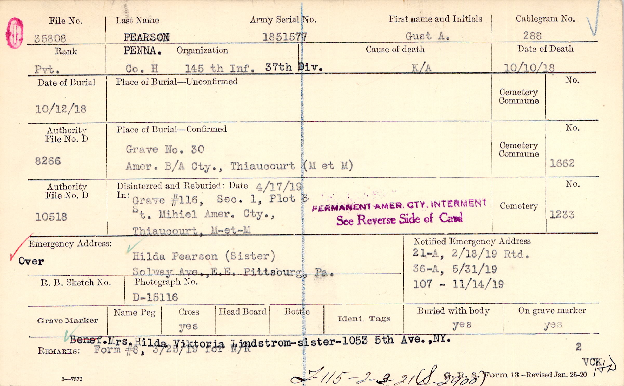 Form 21A: , 2/18/1919 Rtd, Form 36A: , 5/31/1919, Form 107: 11/14/1919