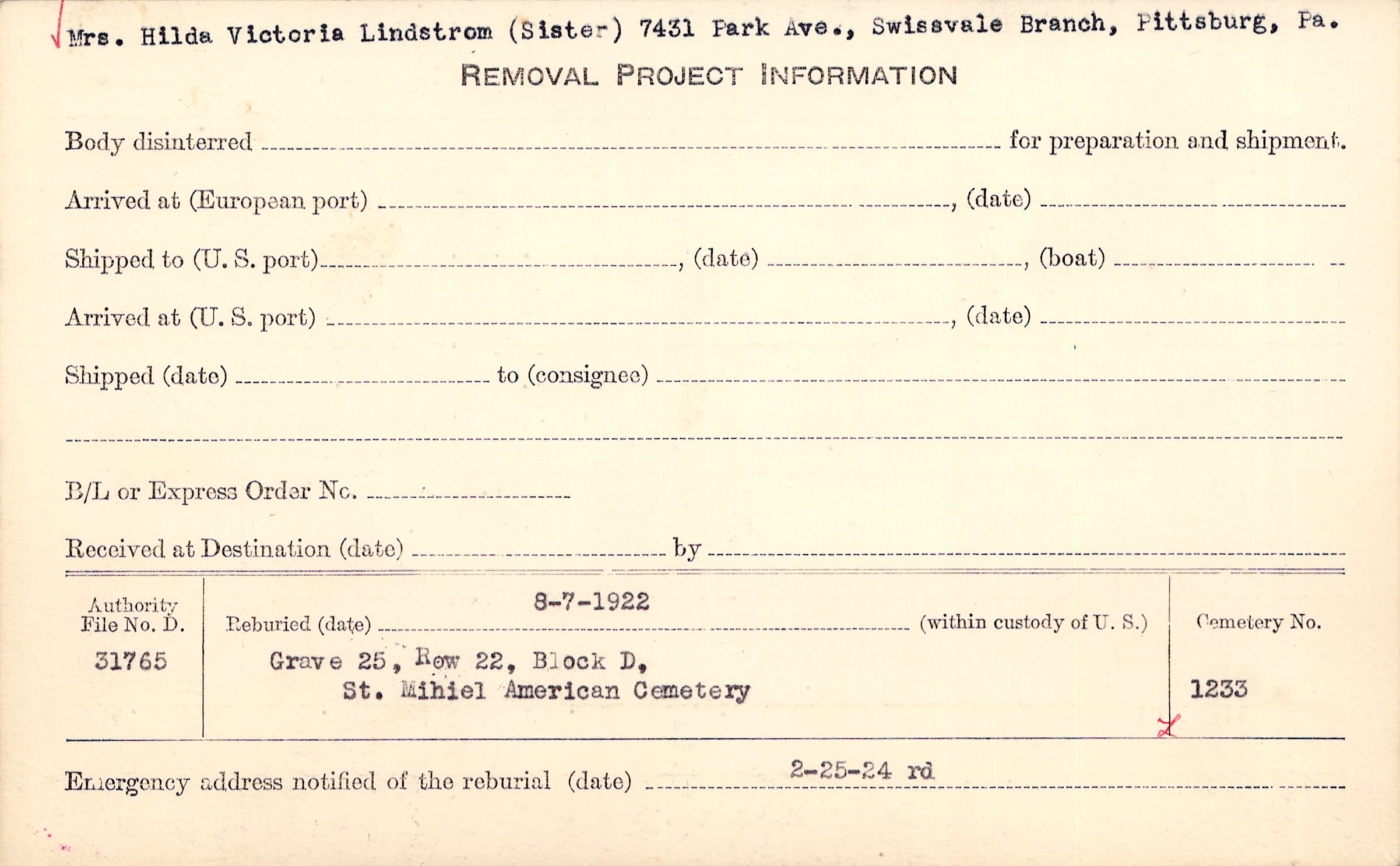 Mrs. Hilda Victoria Lindstrom, (Sister), 7431 Park. Ave., Swissvale Branch, Pittsburg, Pa. |