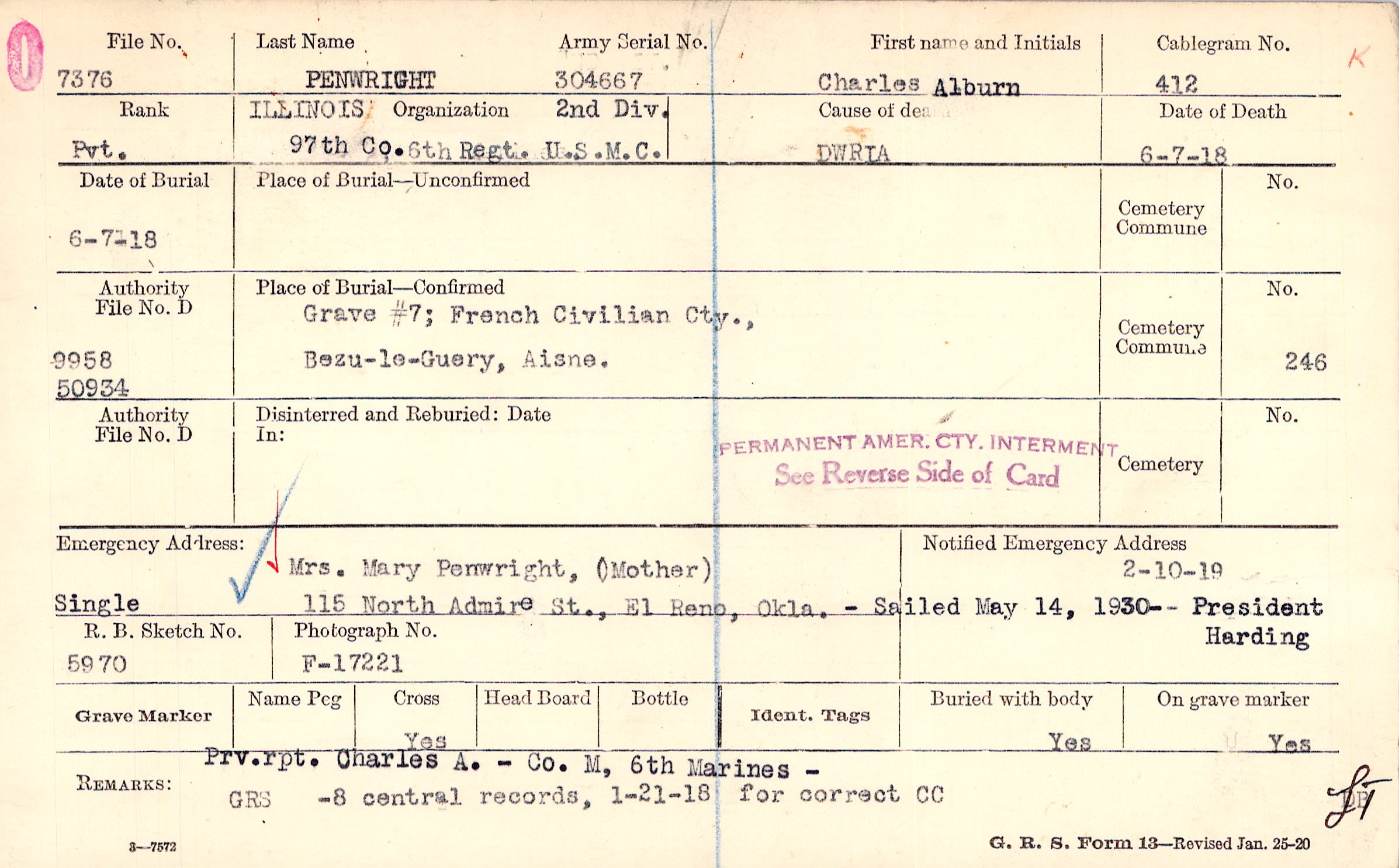 Prv. rpt. Charles A. - Co. M, 6th Marines -, GRS -8 central records, 1-21-18 for correct CC