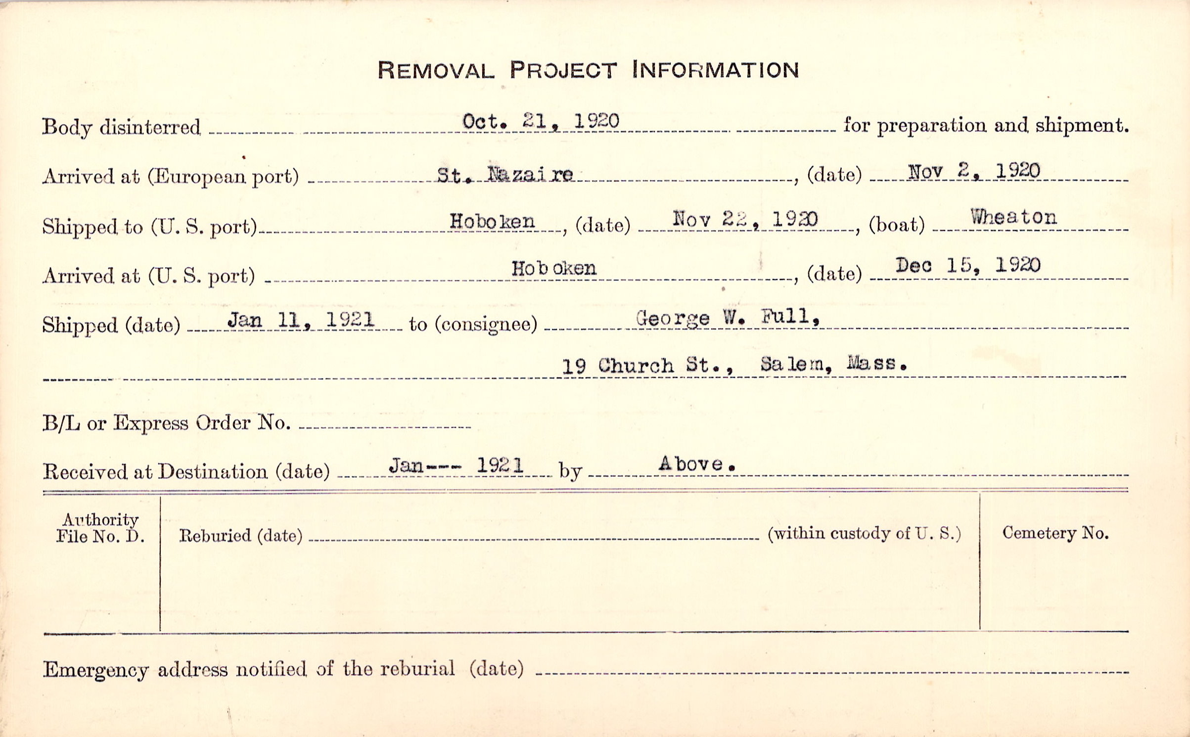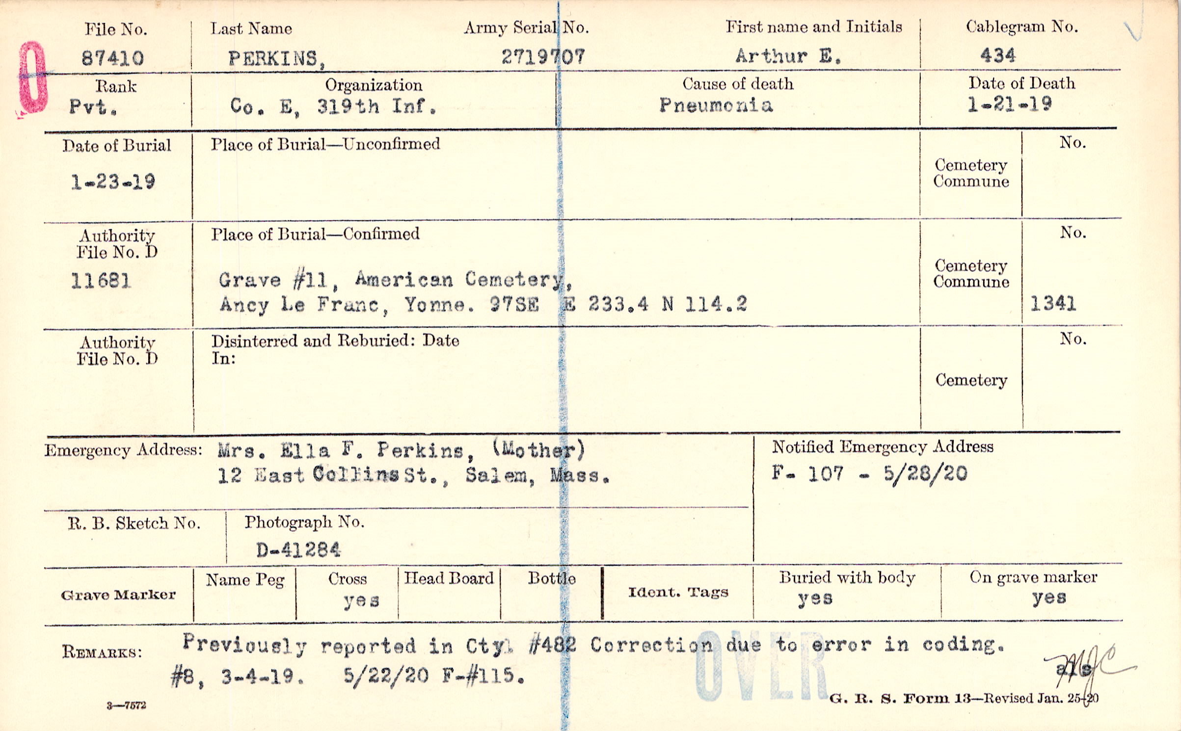 Mrs. Ella F. Perkins, (Mother), 12 East Collins St., Salem, Mass.