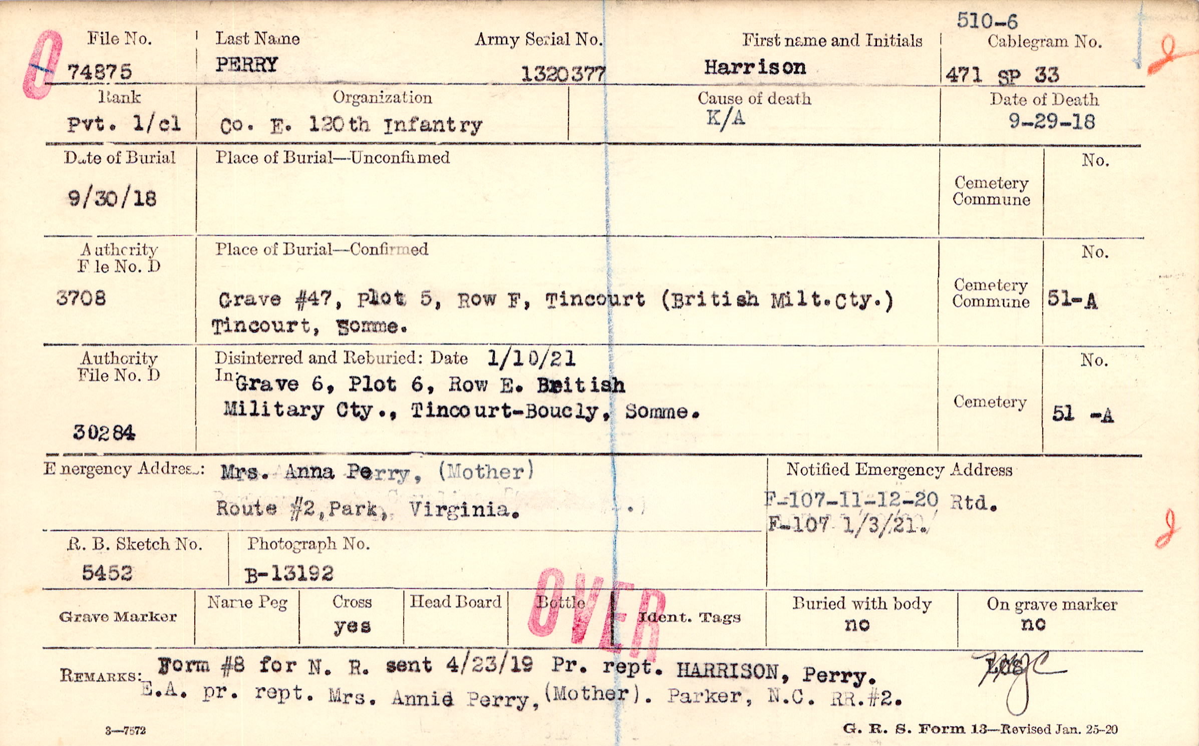 Pr. rept. HARRISON, Perry. E.A. pr. rept. Mrs. Annie Perry, (Mother). Parker, N.C. RR. #2., Form #8 for N. R. sent 4/23/19
