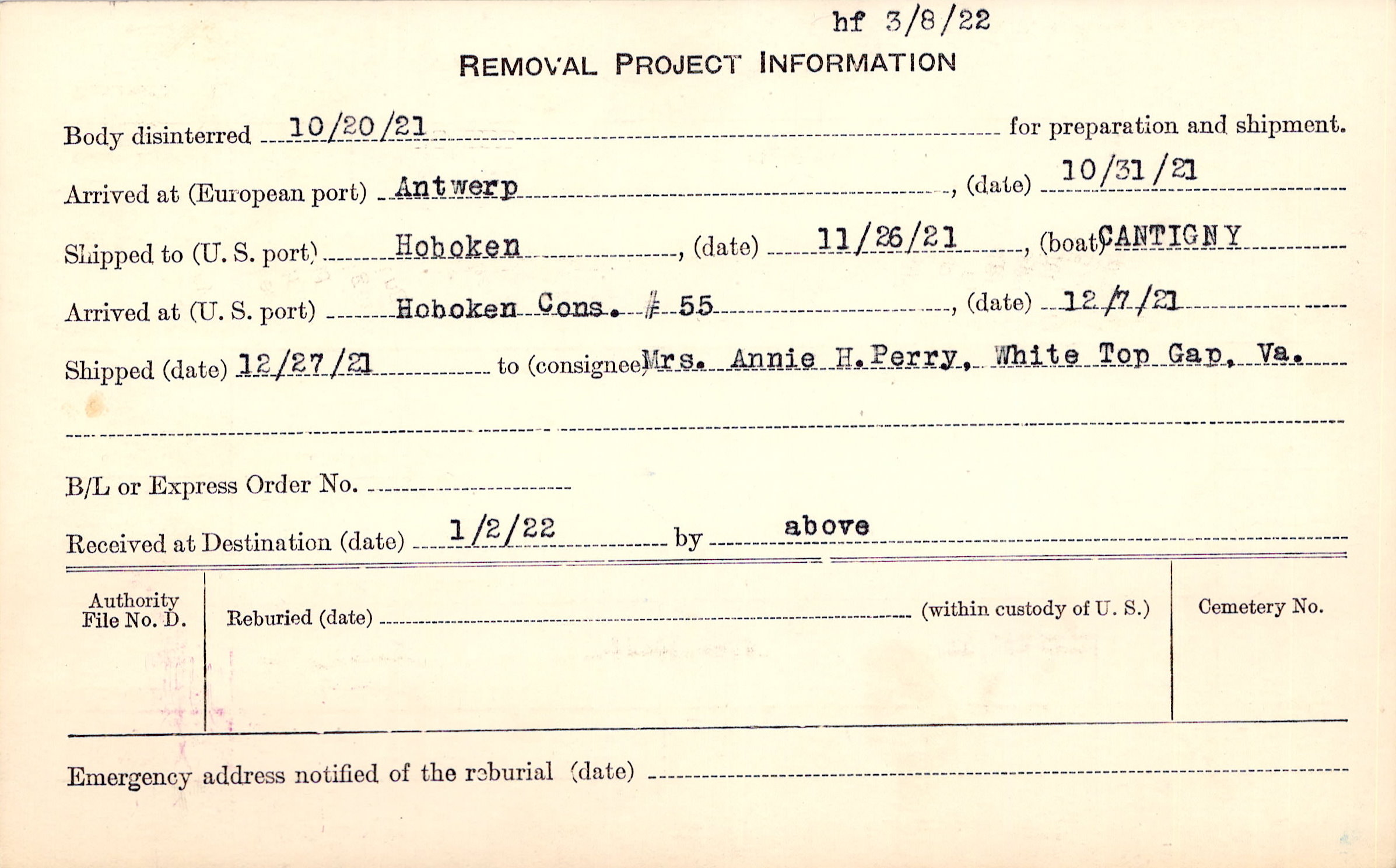 Body disinterred 10/20/1921 for preparation and shipment.