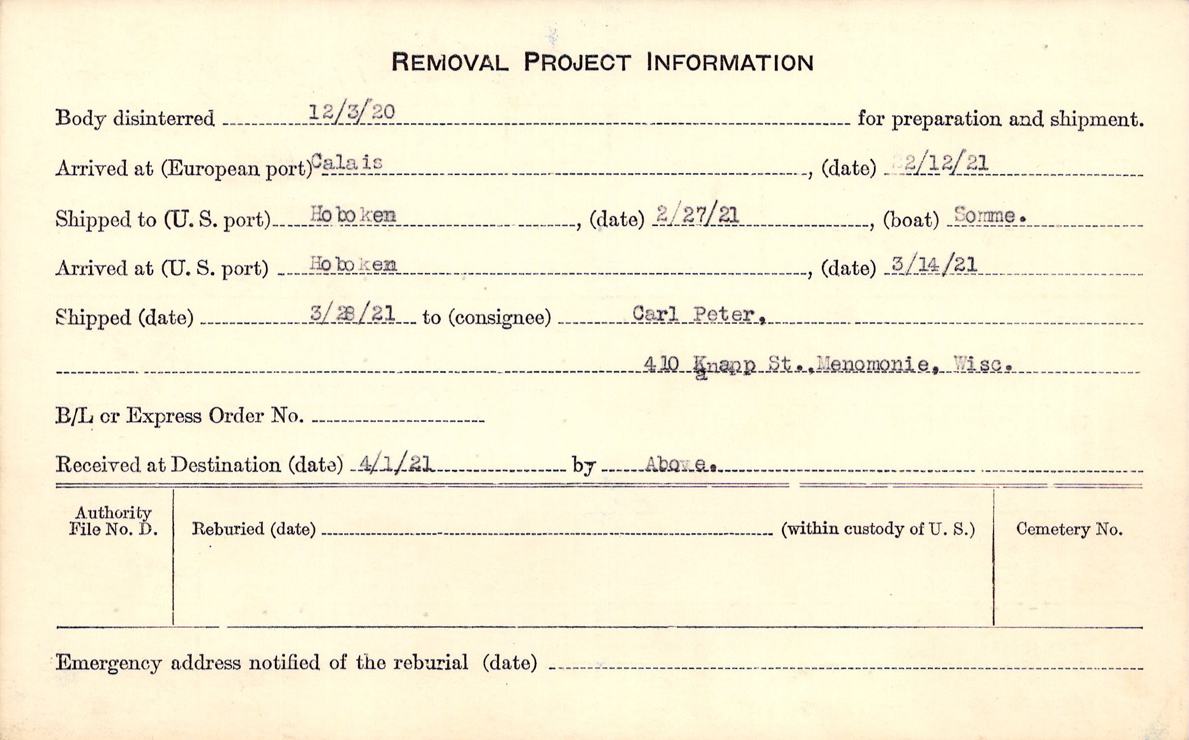 Body disinterred 12/3/1920 for preparation and shipment.