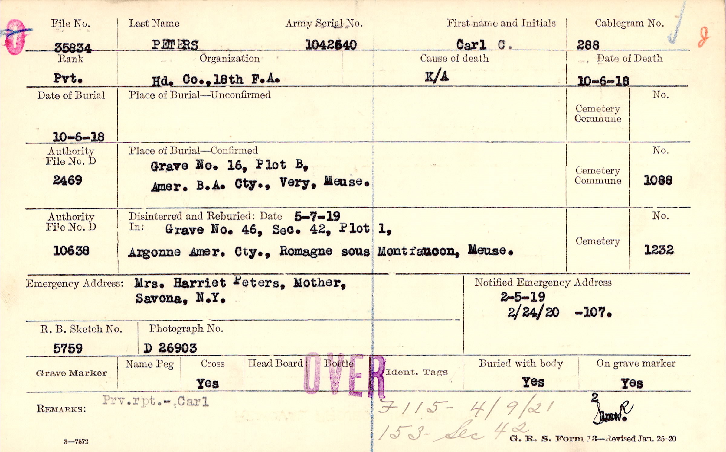 Grave 16, Plot B, Amer. B/A Cty., Very, Meuse.,
