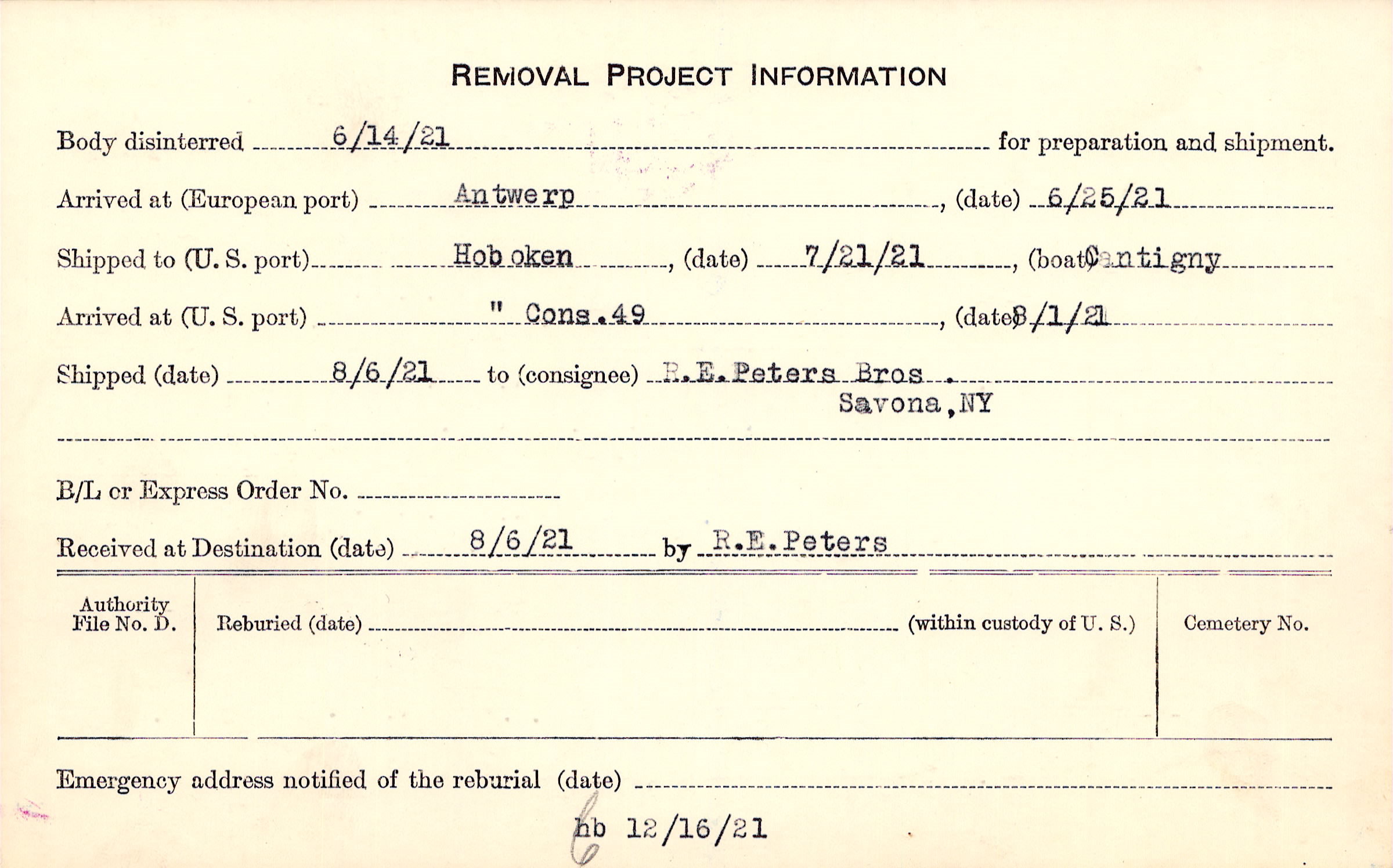 Body disinterred 6/14/1921 for preparation and shipment.