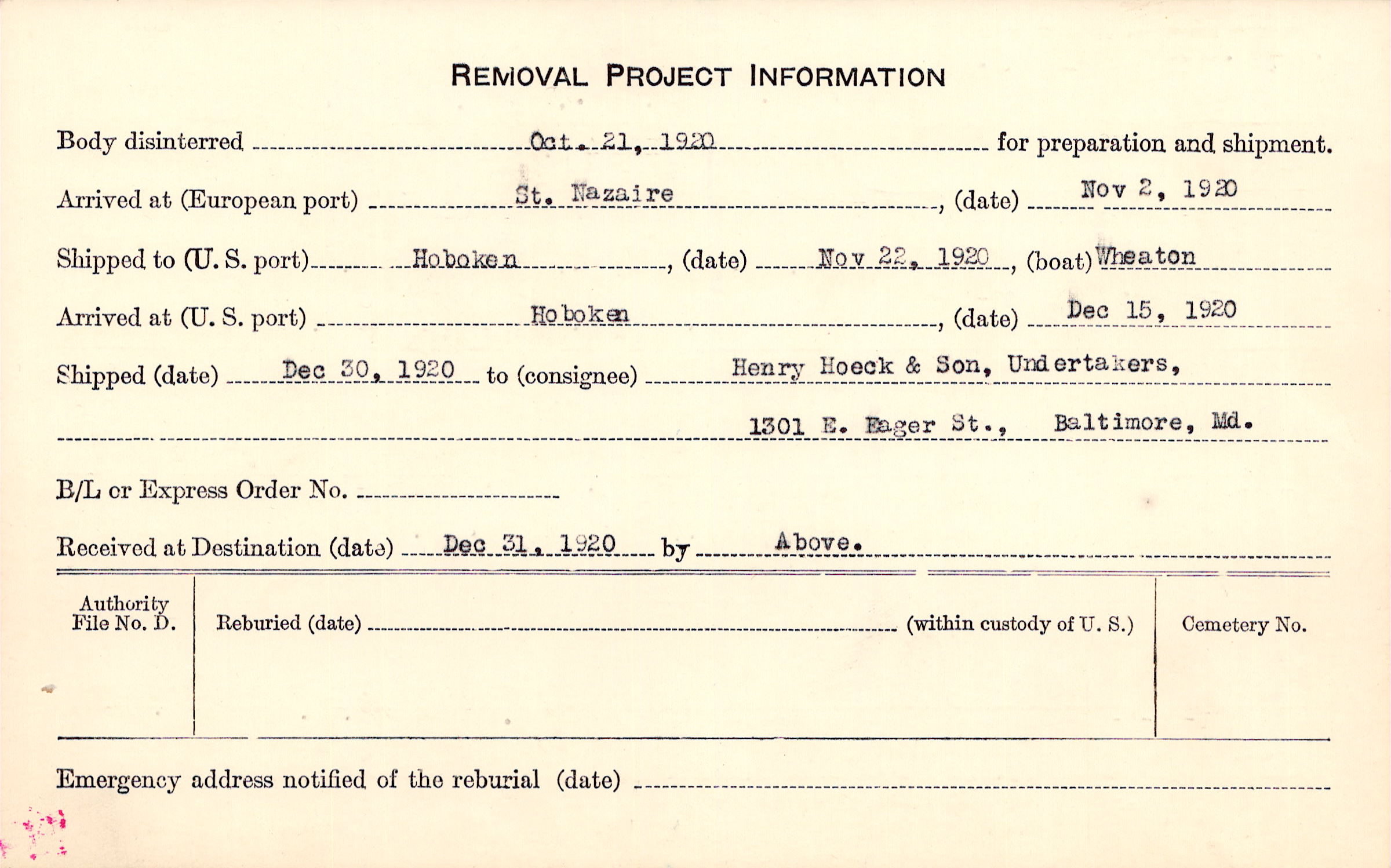 Body disinterred 10/21/1920 for preparation and shipment.
