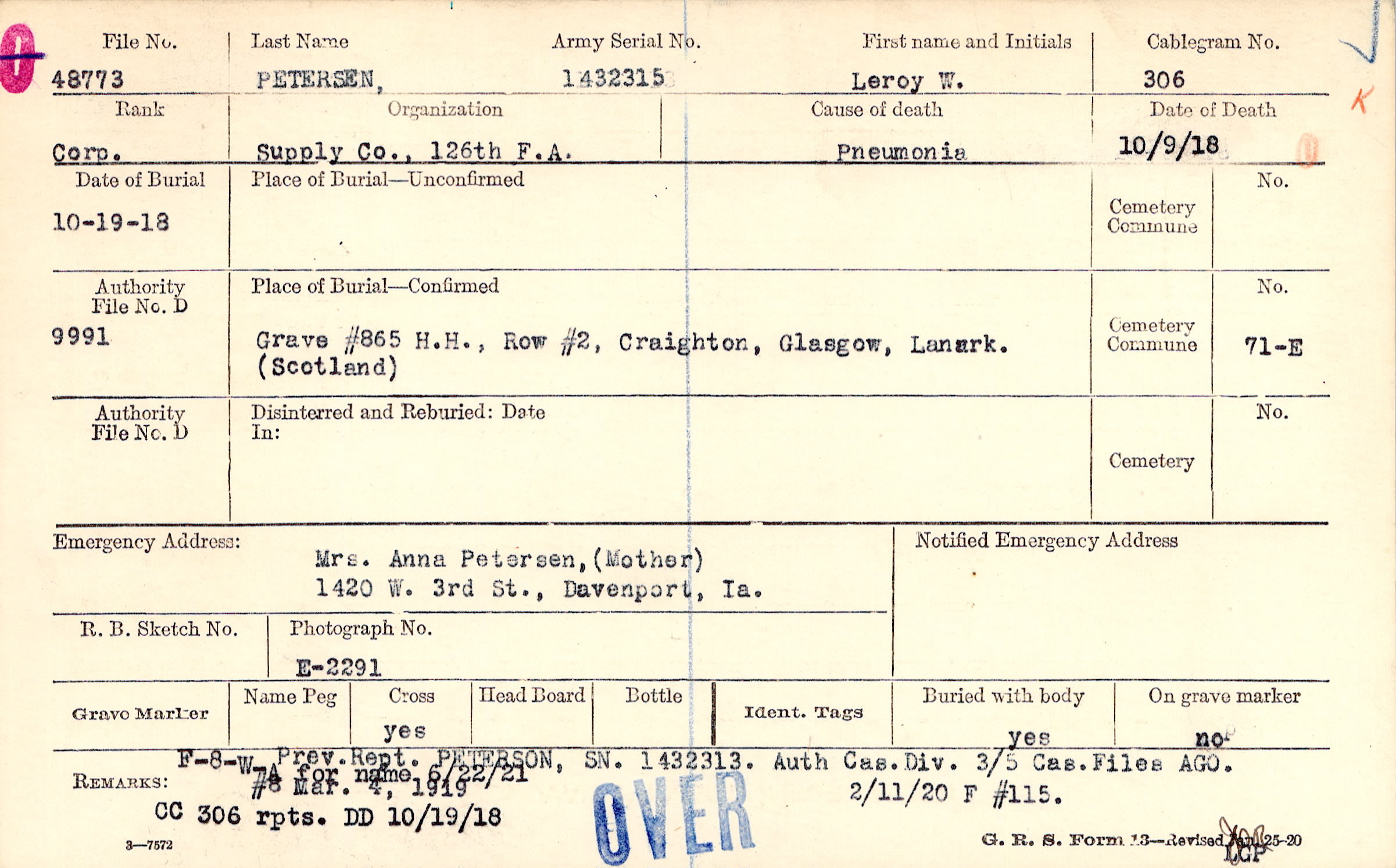 Prev. Rept. PETERSON, SN. 1432313. Auth Cas. Div. 3/5 Cas. Files AGO, CC 306 rpts. DD 10/19/18, F-8-W-A Prev. Rept. Peterson, SN. 1432313. Auth Cas. Div. 3/5 Cas. Files AGO #8 Mar. 4, 1919, 2/11/20 F #115.