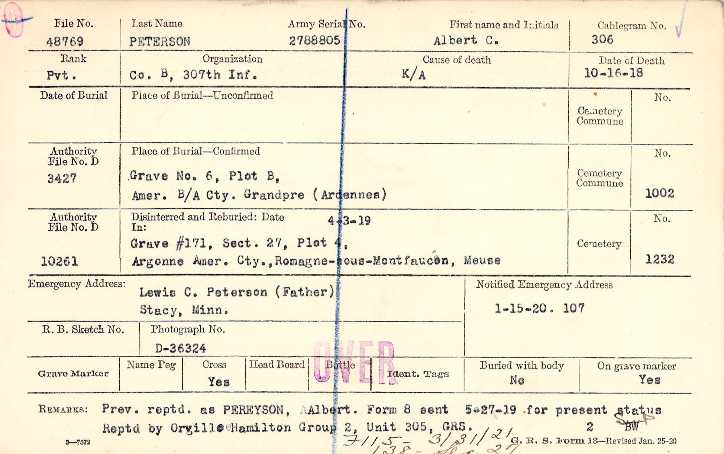 Grave 6, Plot B, Amer. B/A Cty., Grandpre, Ardennes