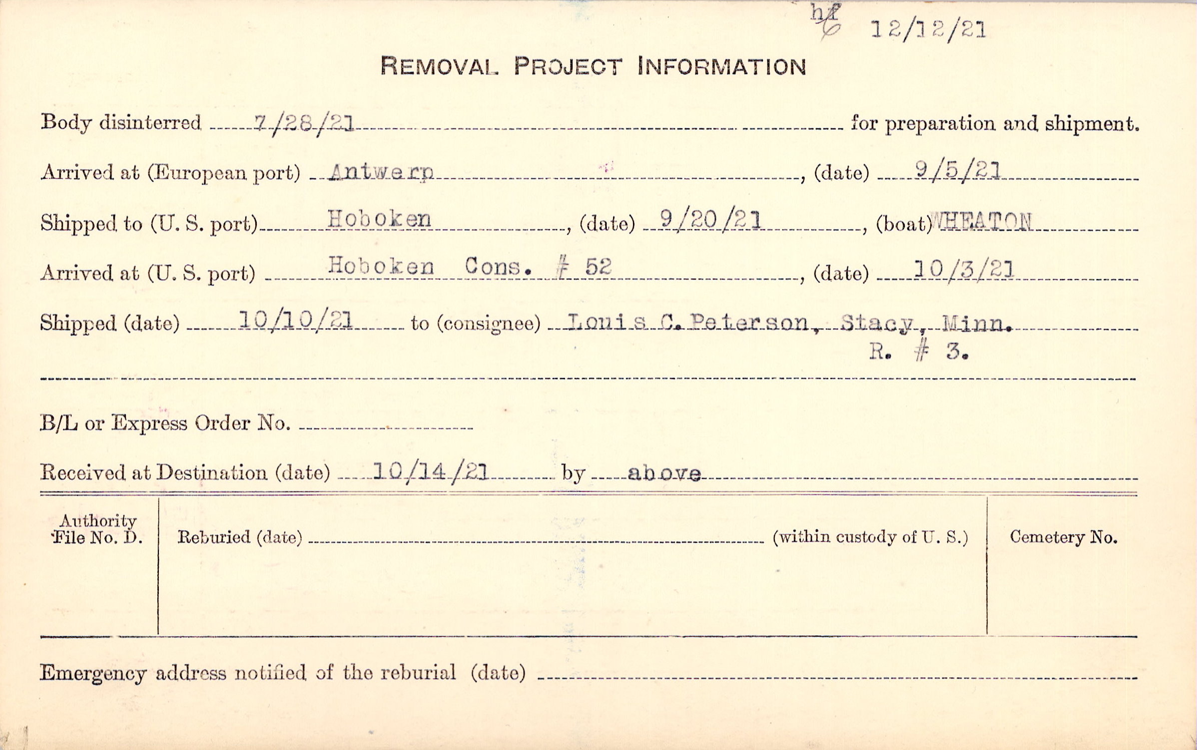 Body disinterred 7/28/1921 for preparation and shipment.