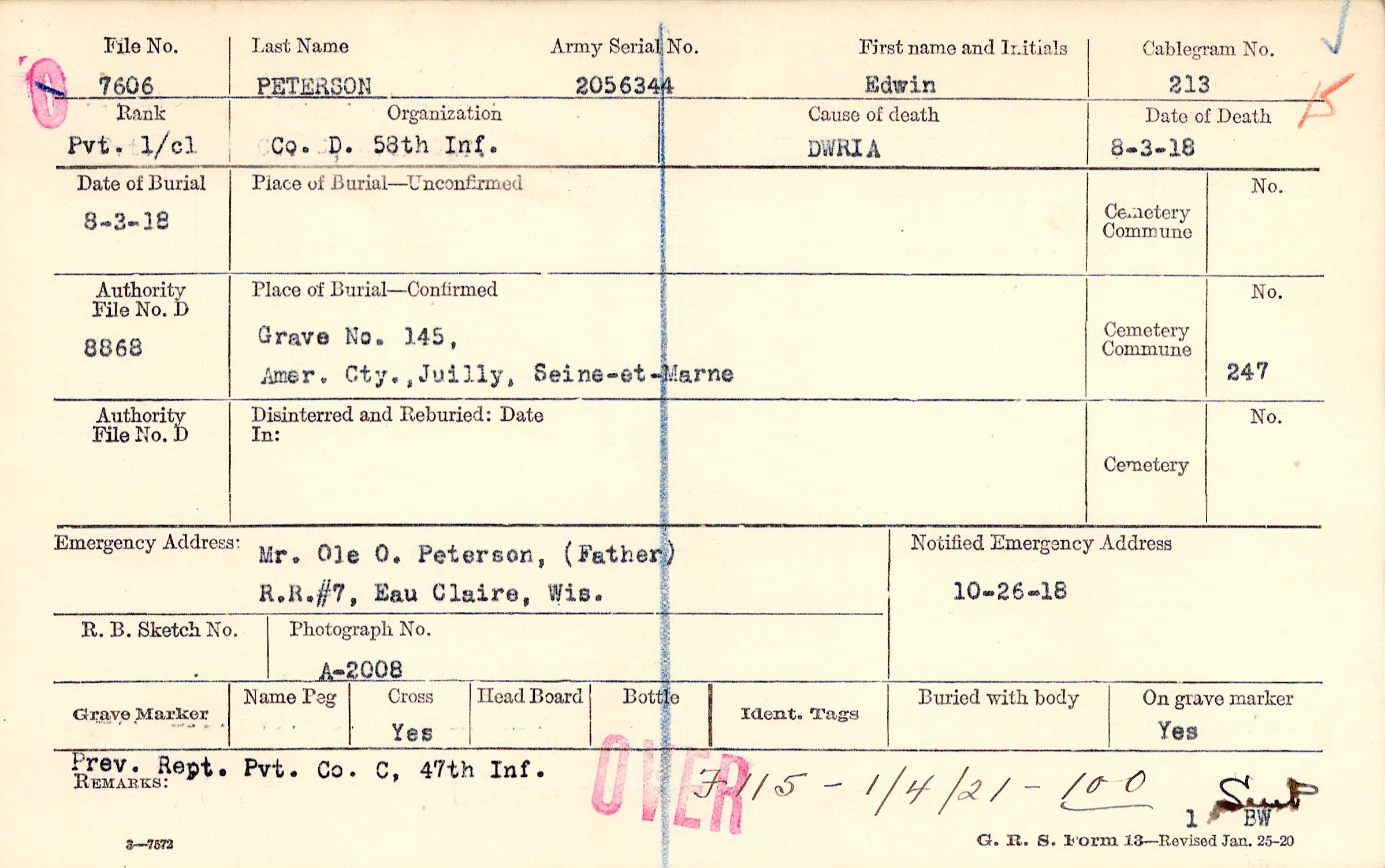Mr. Ole O. Peterson, (Father), R.R.#7, Eau Claire, Wis.