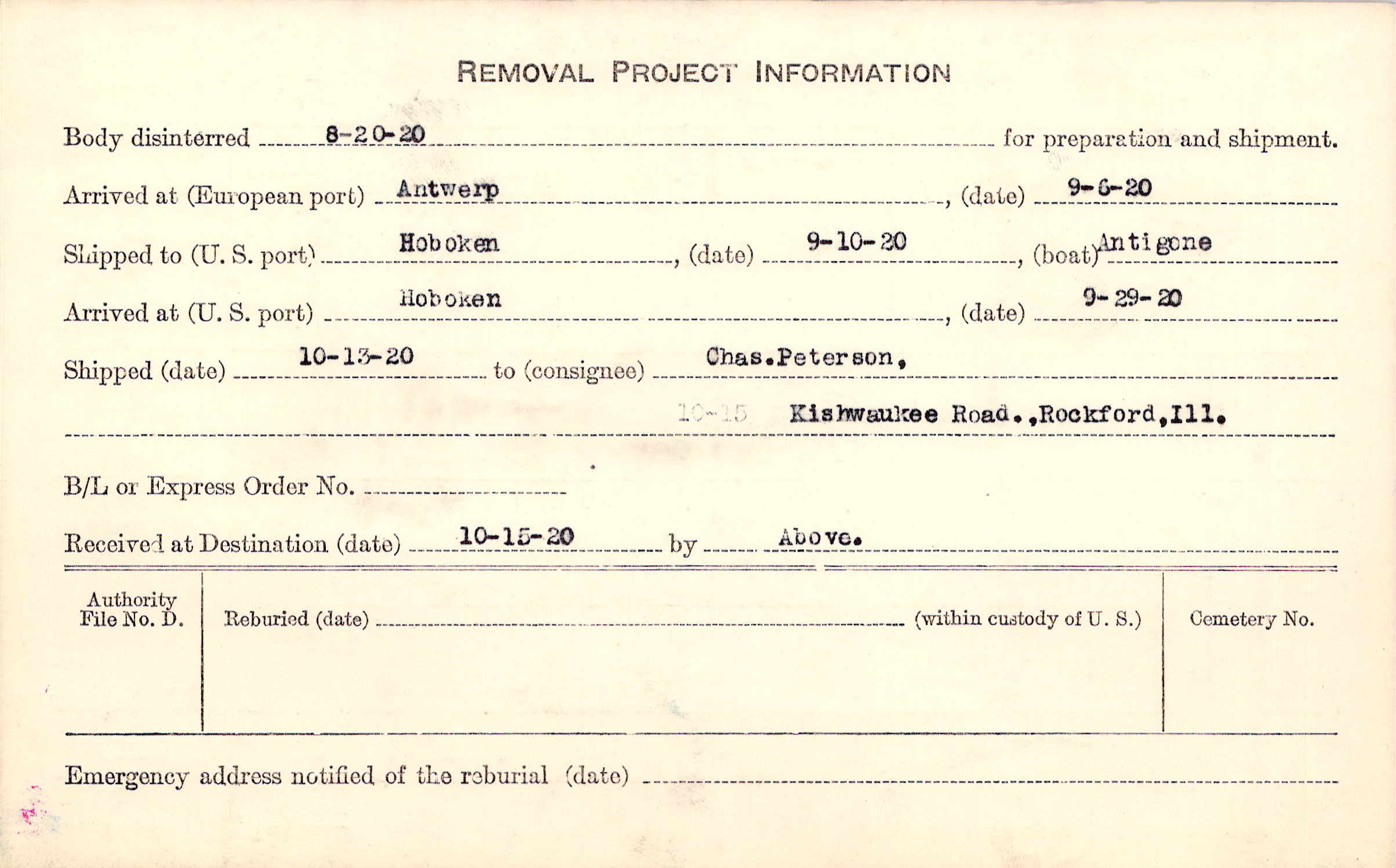 Body disinterred 8/20/1920 for preparation and shipment.