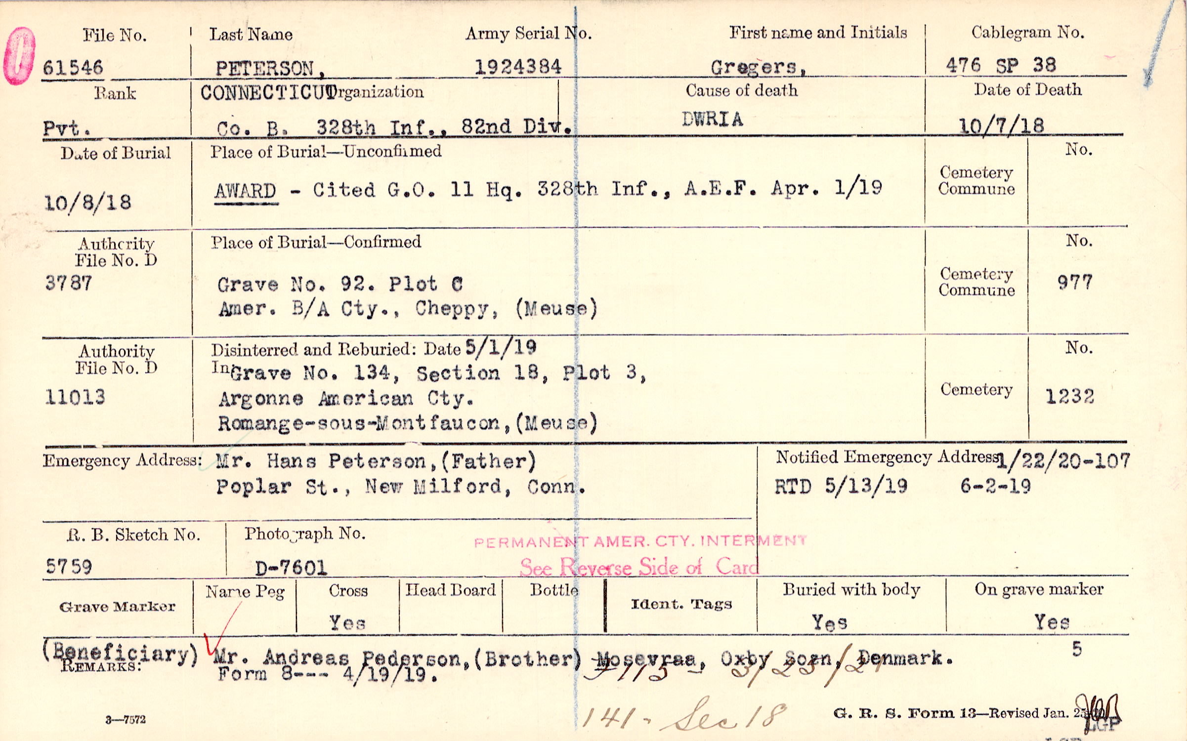 Grave 134, Section 18, Plot 3, Argonne American Cemetery, Romagne-sous-Montfaucon, Meuse