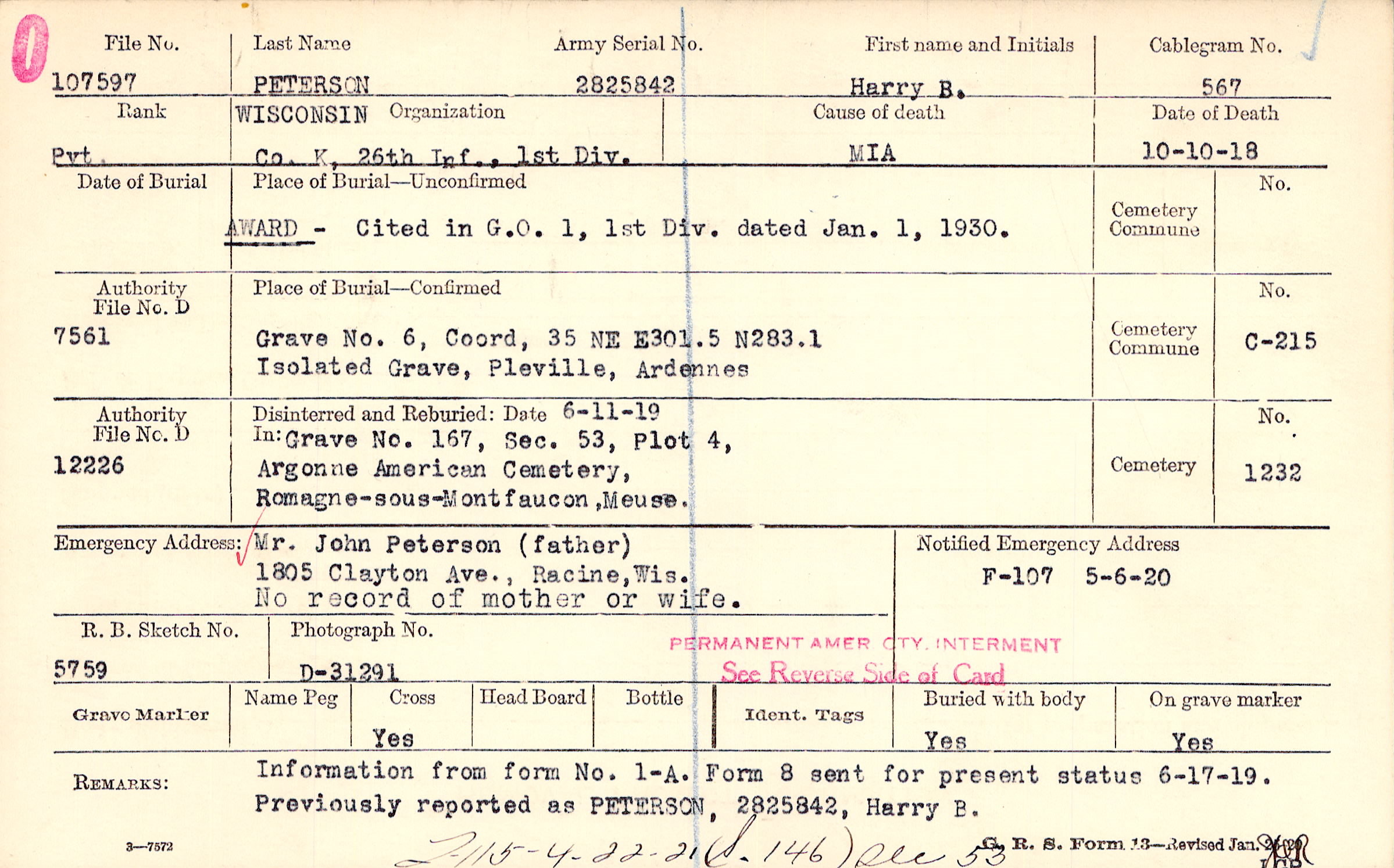 Mr. John Peterson (father), 1805 Clayton Ave., Racine, Wis., No record of mother or wife Information from form No. 1-A. Form 8 sent for present status 6-17-19 Previously reported as PETERSON, 2825842, Harry B. 7115-4-22-21(S.146) sec 53