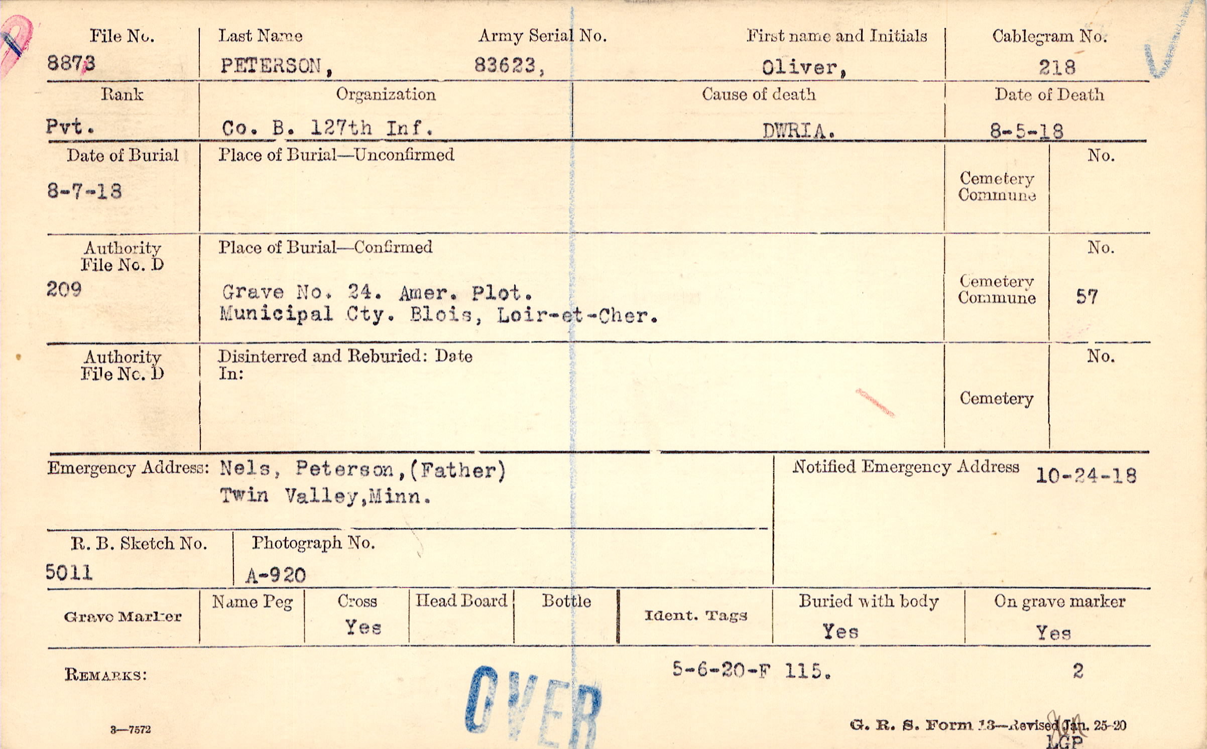 Grave 24., Amer. Plot., Municipal Cty., Blois, Loir-et-Cher.