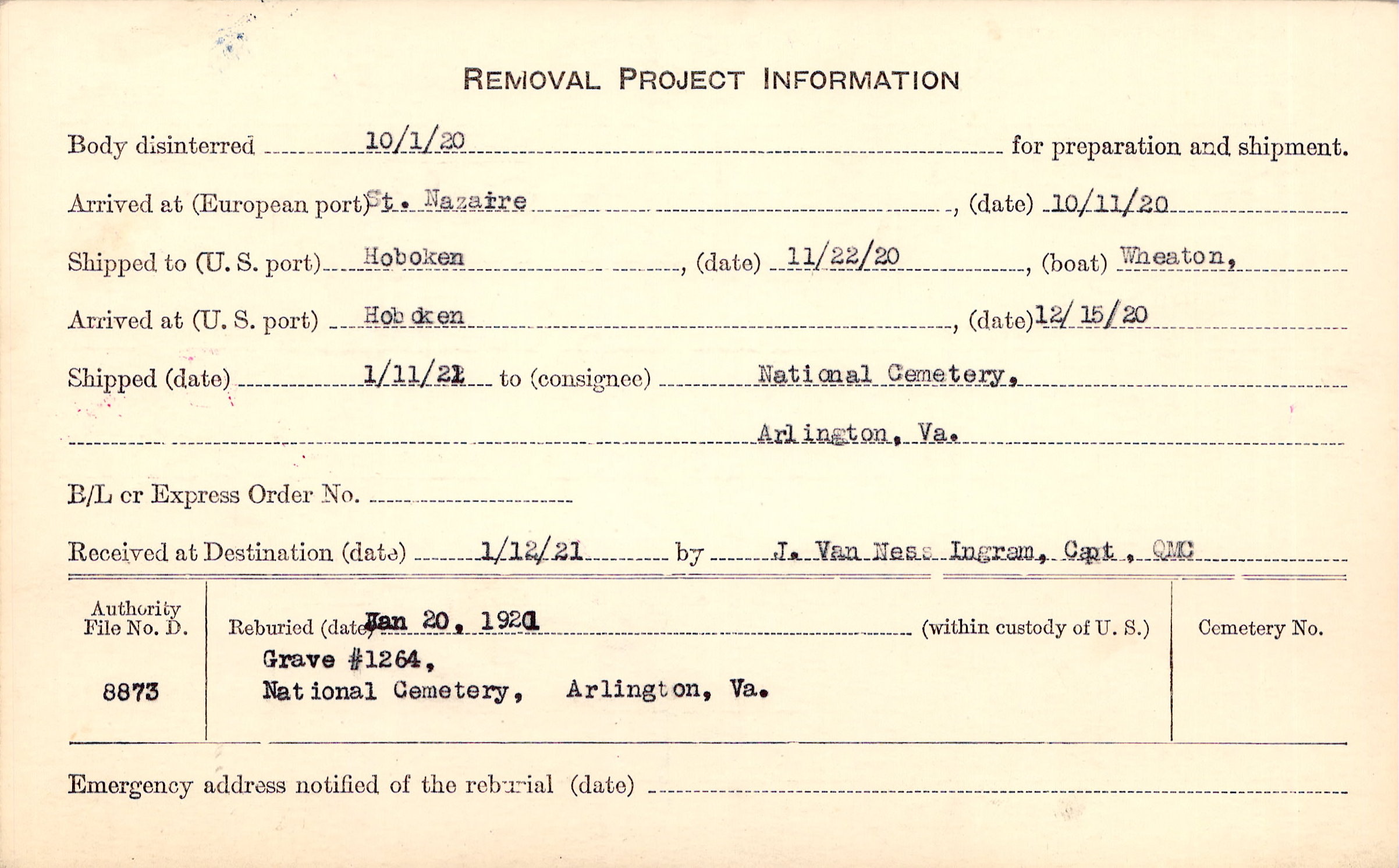 Body disinterred 10/1/1920 for preparation and shipment.