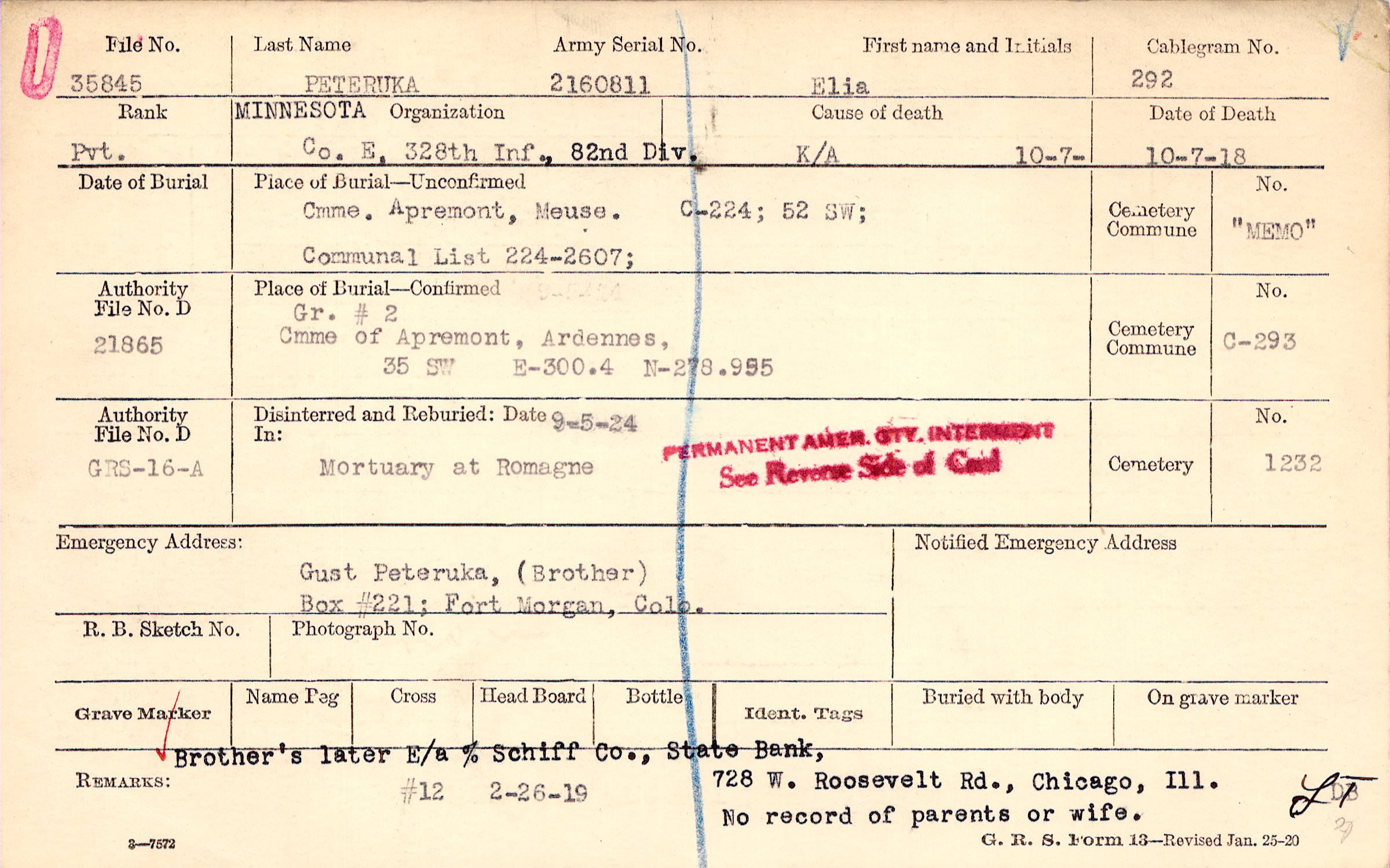 Brother's later E/a % Schiff Co., State Bank, 728 E. Roosevelt Rd., Chicago, Ill. No record of parents or wife., #12 2-26-19