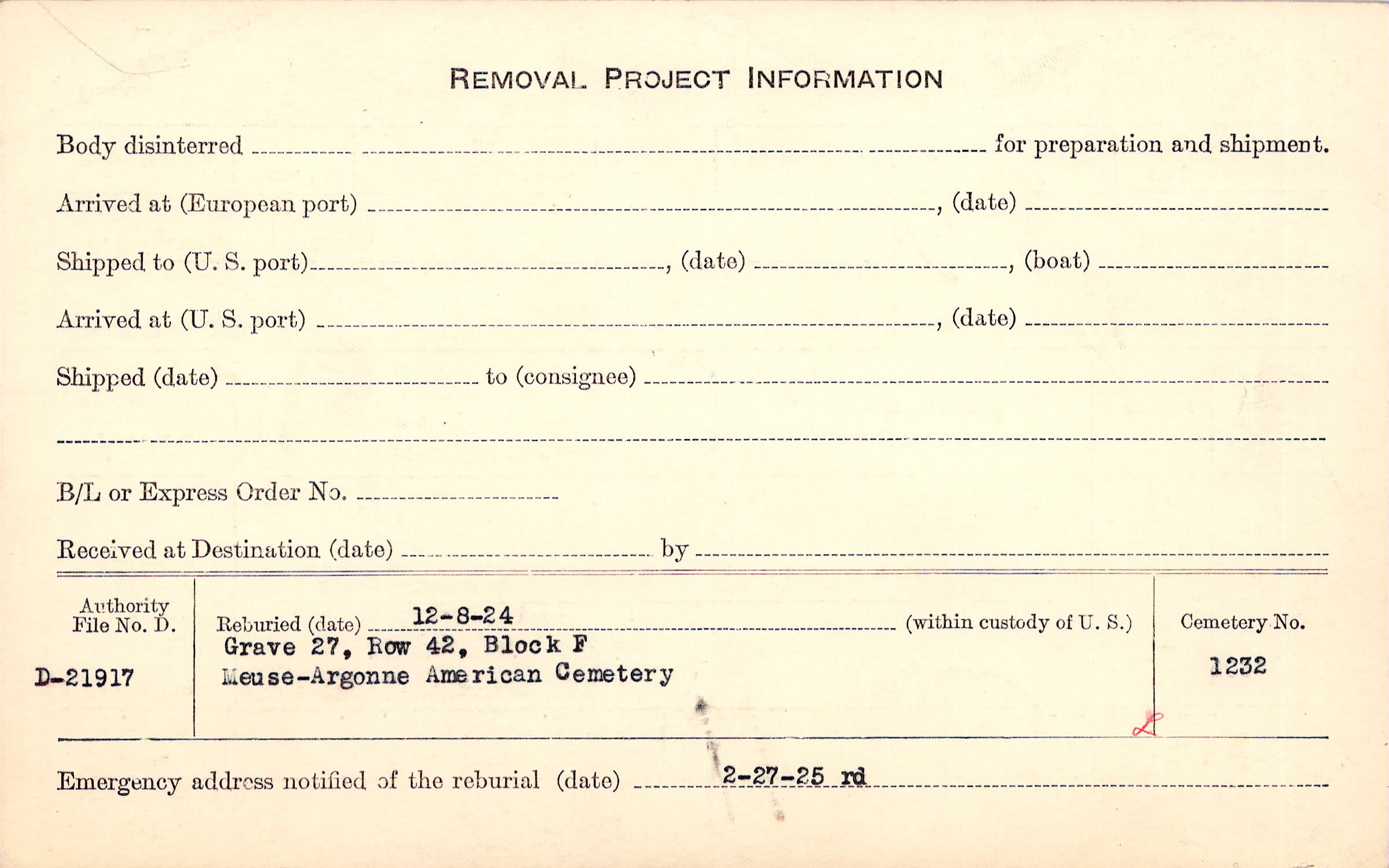 | Permanent Burial in Foreign Cemetery |