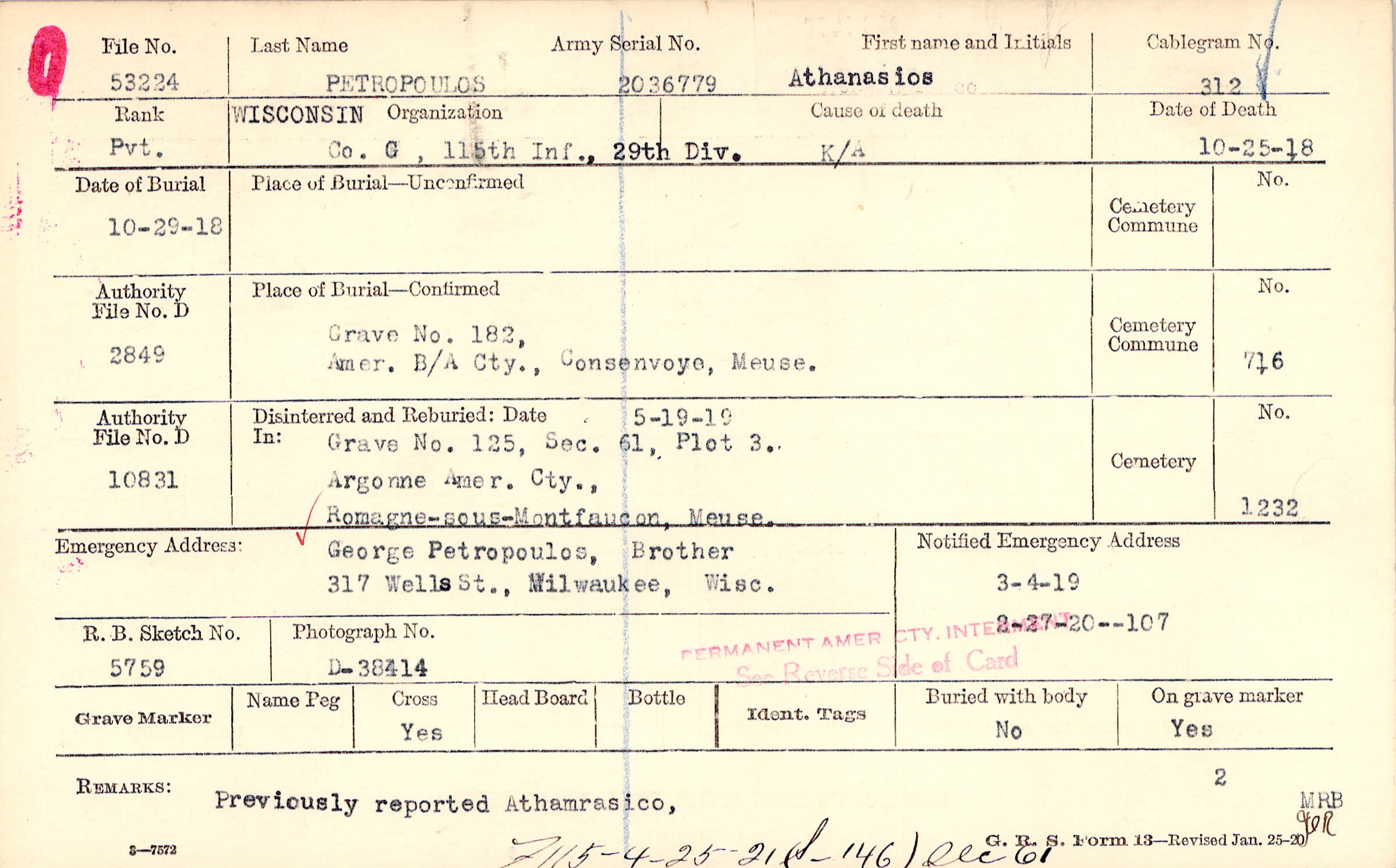 Grave 182, Amer. B/A Cty., Consenvoye, Meuse.