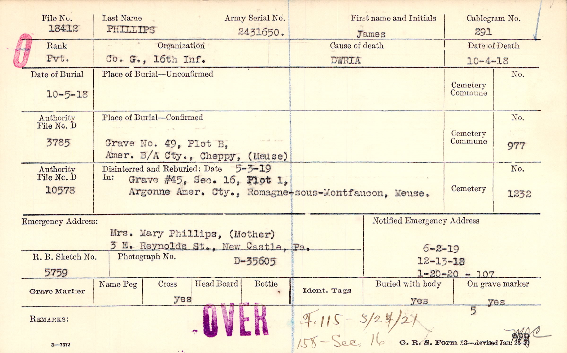 Mrs. Mary Phillips, (Mother), 3 E. Reynolds St., New Castle, Pa.