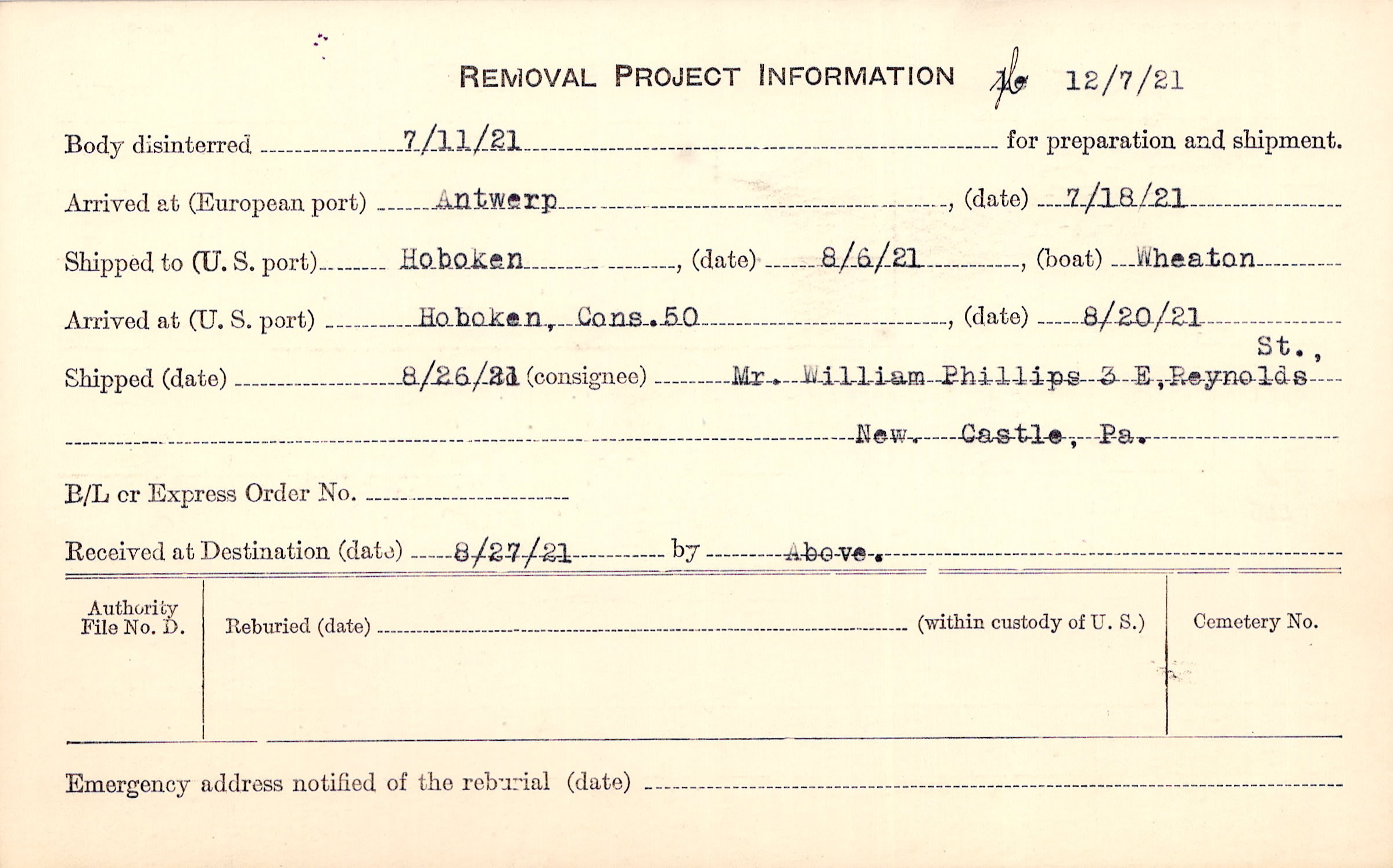 Body disinterred 7/11/1921 for preparation and shipment.