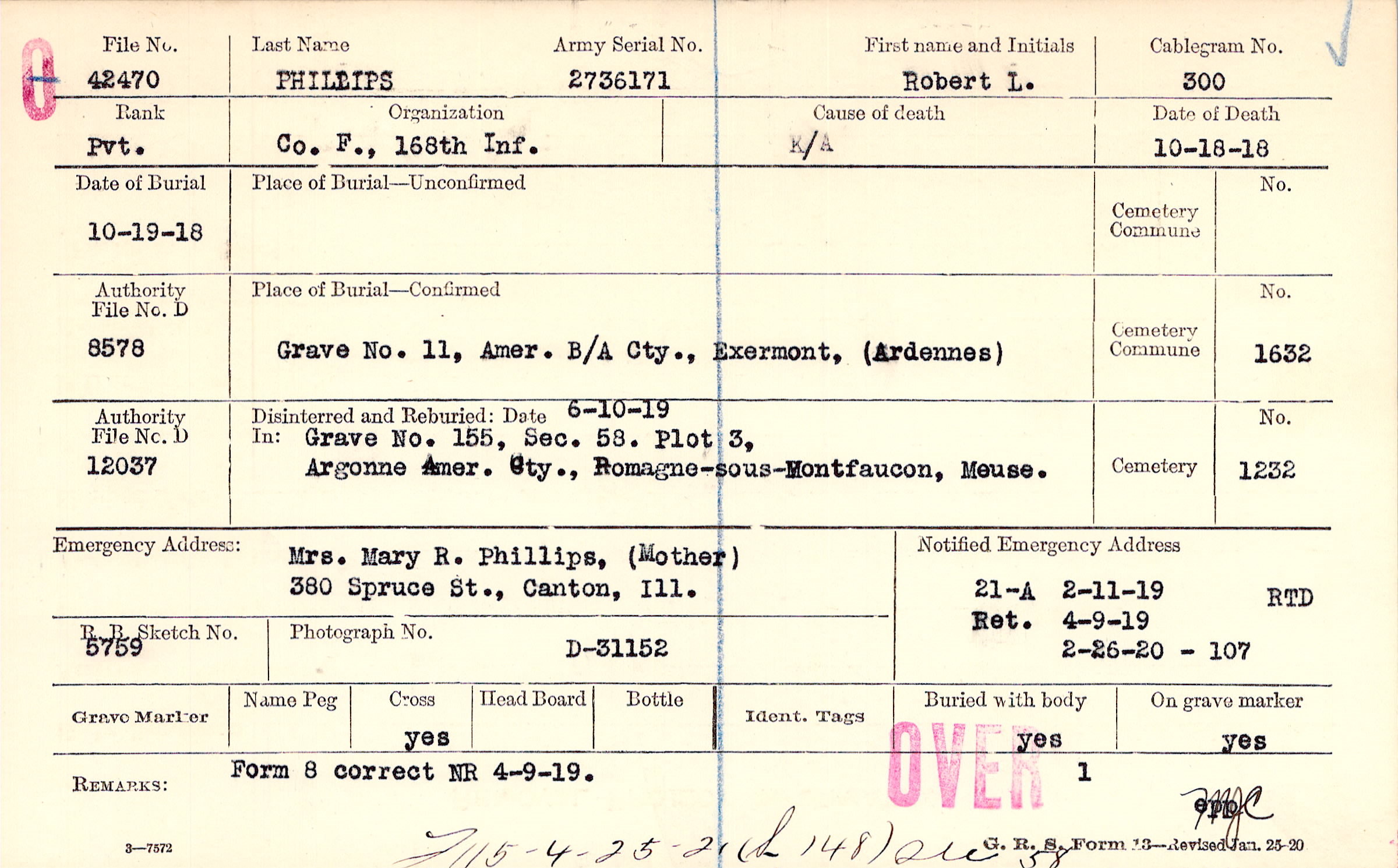 Mrs. Mary R. Phillips, (Mother), 380 Spruce St., Canton, Ill.