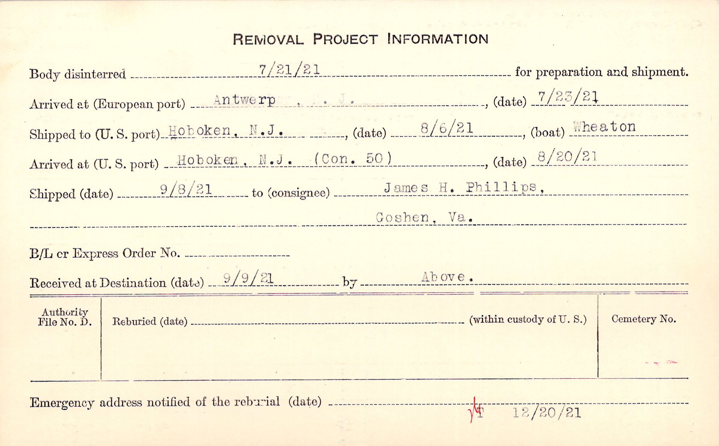 Body disinterred 7/21/1921 for preparation and shipment.