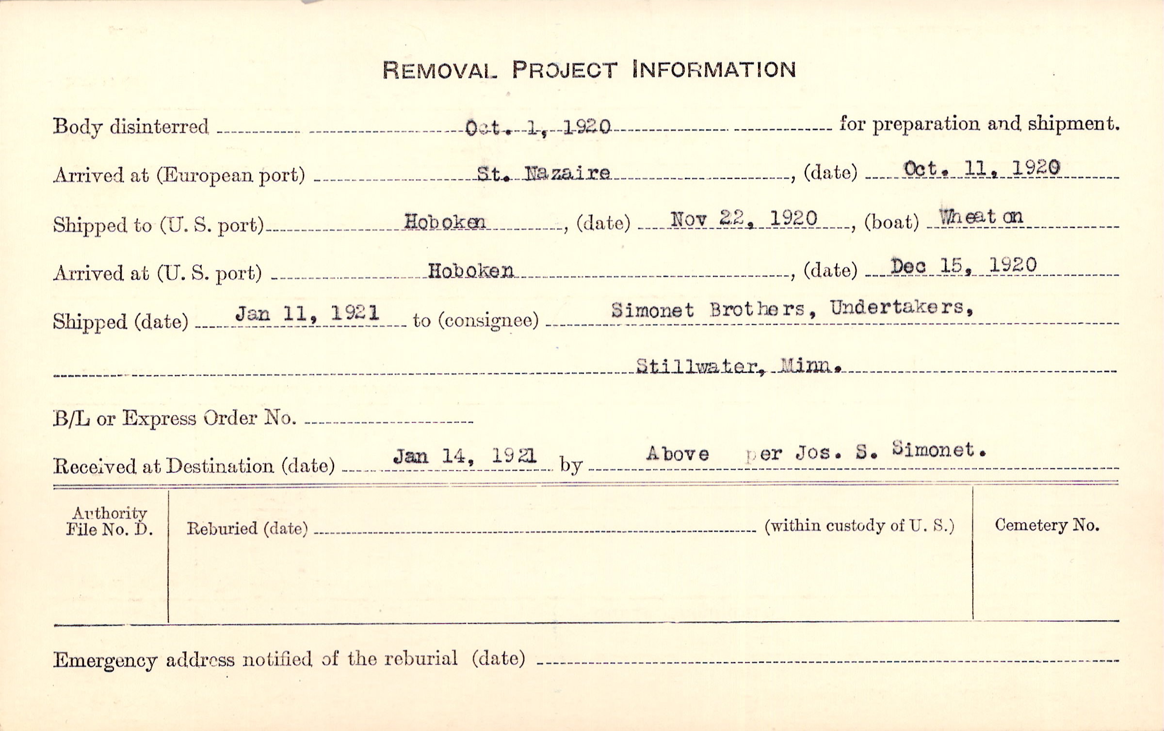 Body disinterred 10/1/1920 for preparation and shipment.