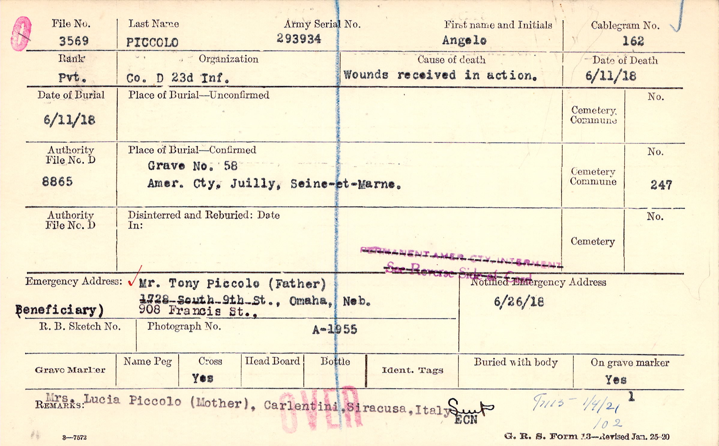 Mr. Tony Piccolo (Father), 908 Francis St., Omaha, Neb., (Beneficiary)