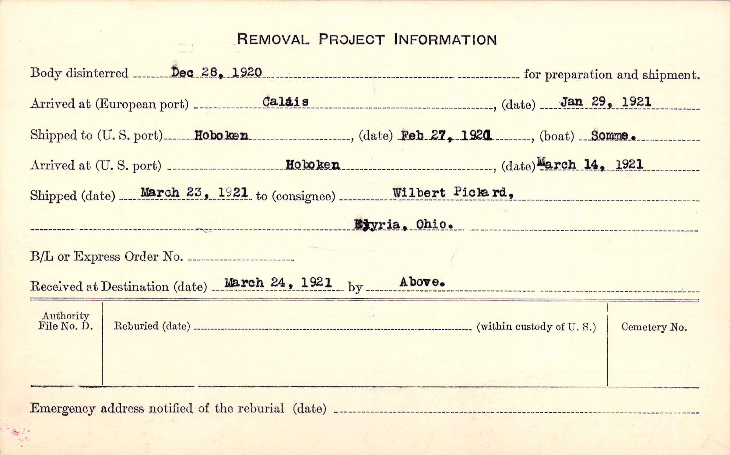 Body disinterred 12/28/1920 for preparation and shipment.