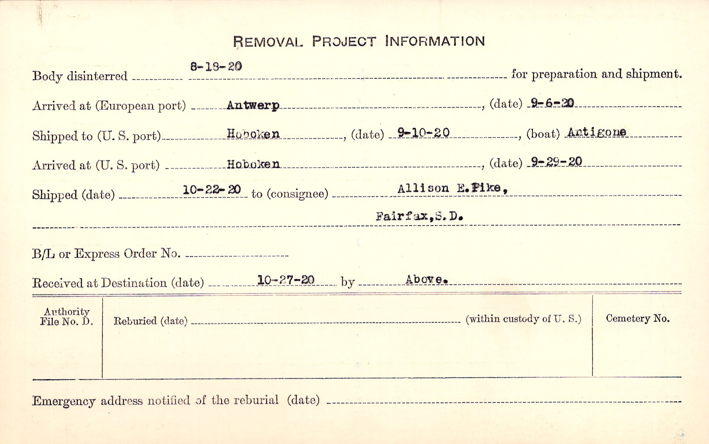 Body disinterred 8/18/1920 for preparation and shipment.