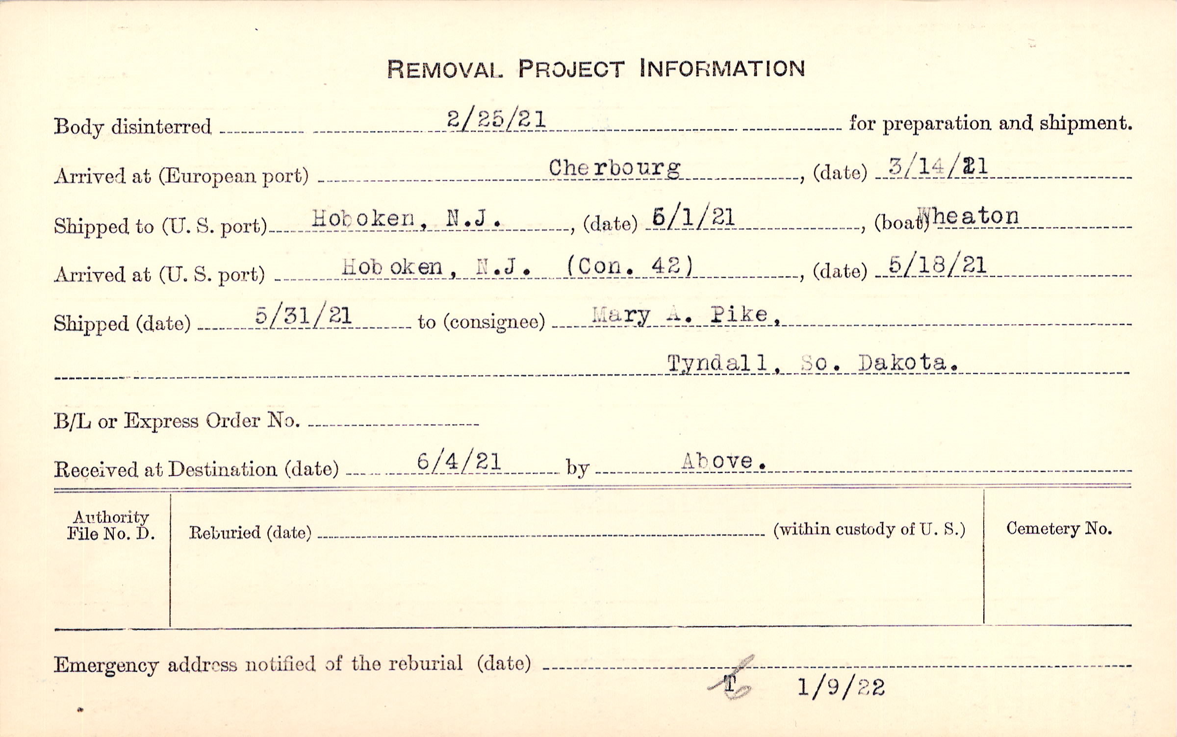 Body disinterred 2/25/1921 for preparation and shipment.