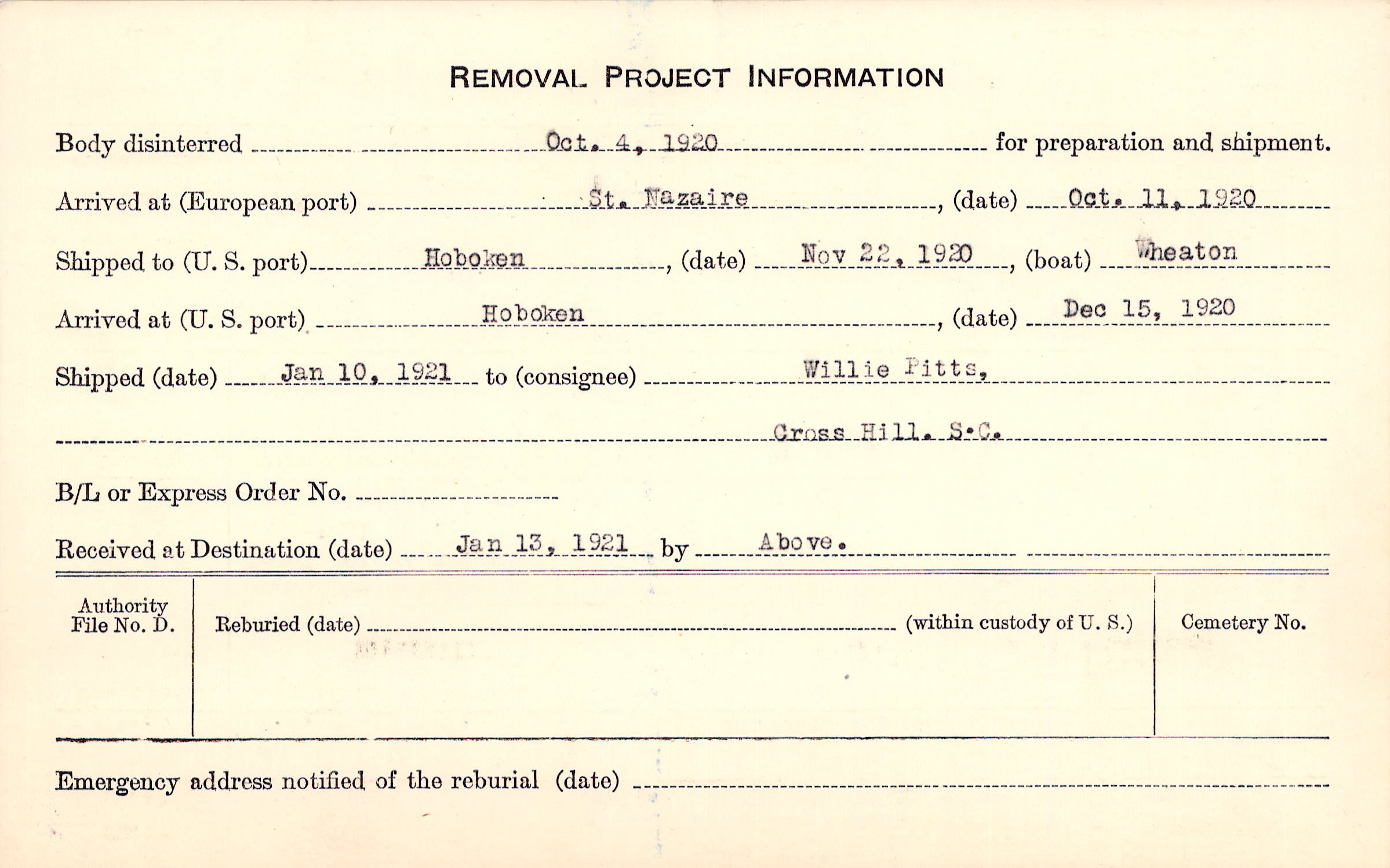 Body disinterred 10/4/1920 for preparation and shipment.