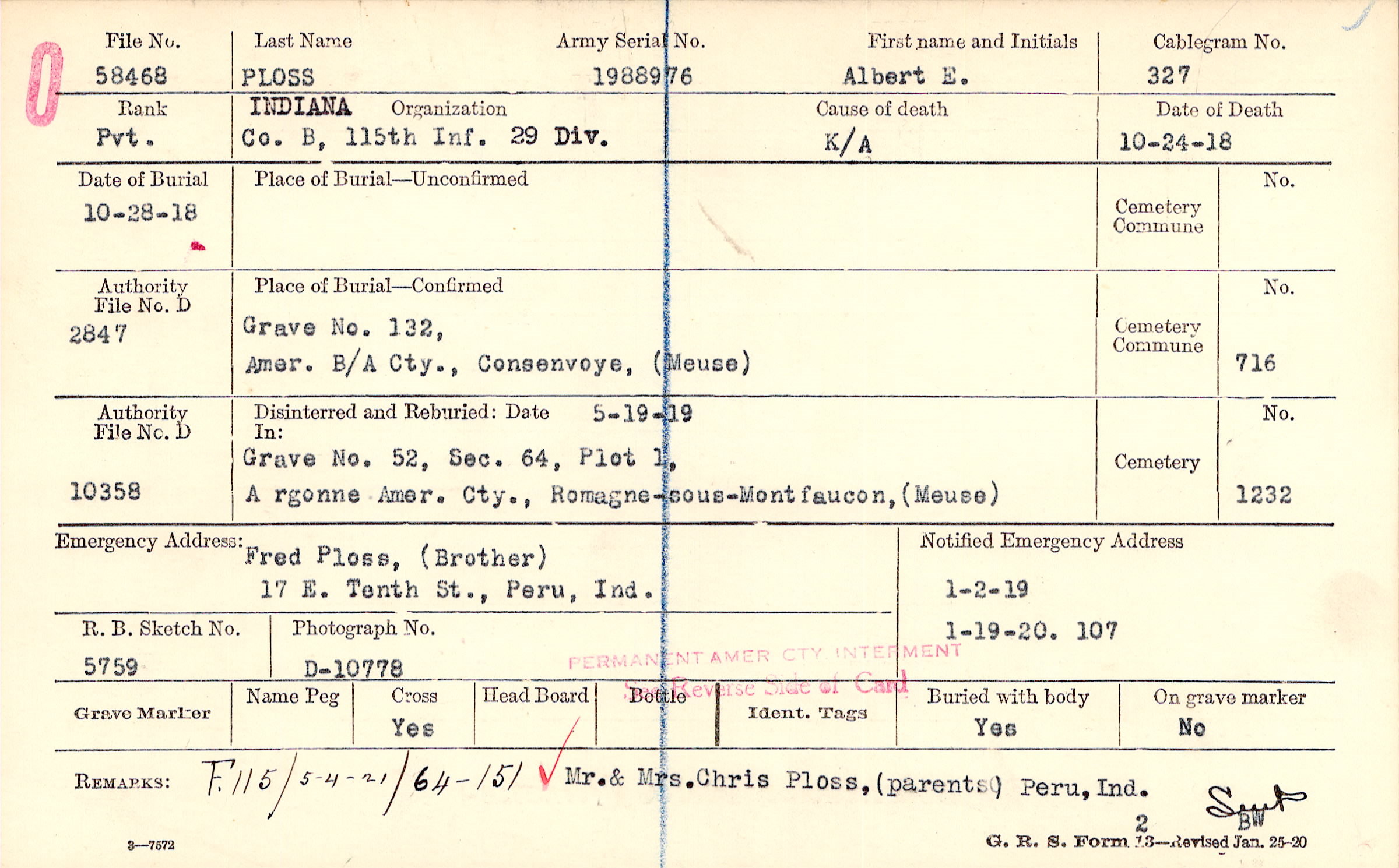 Fred Ploss, (Brother), 17 E. Tenth St., Peru, Ind.