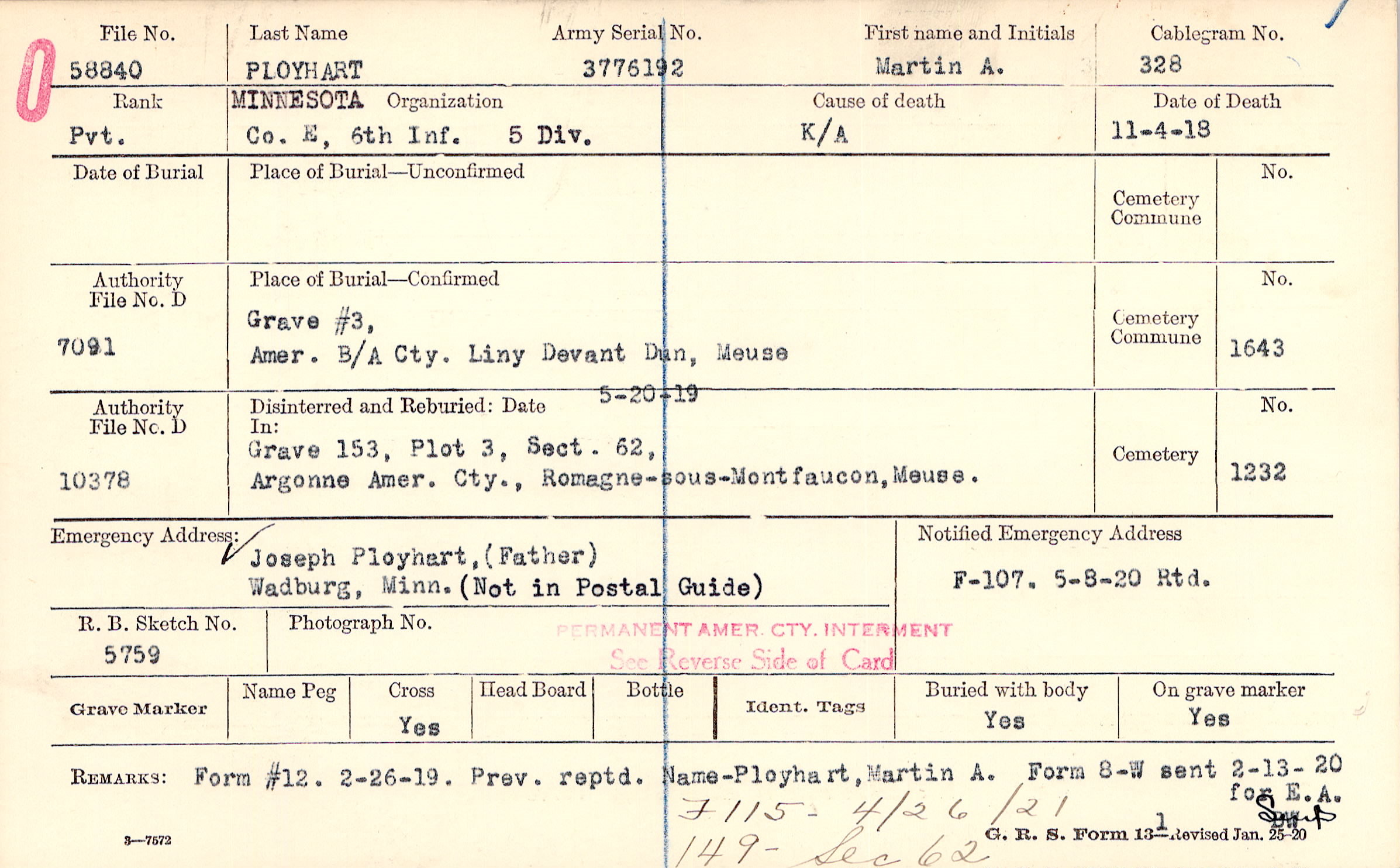 Grave 153, Section 62, Plot 3, Argonne American Cemetery, Romagne-sous-Montfaucon, Meuse