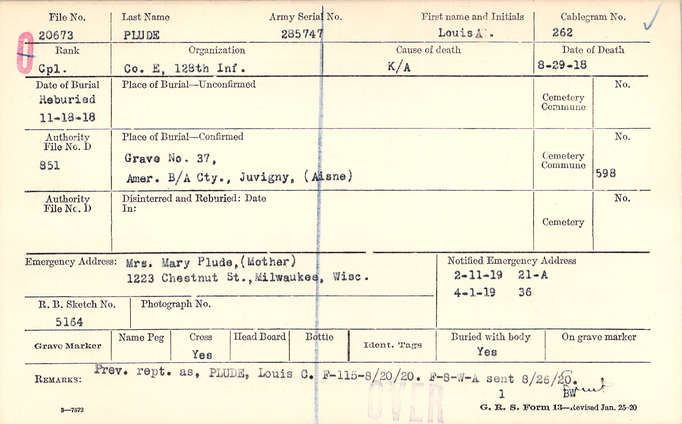 Prev. rept. as, PLUDE, Louis C., F-8-W-A sent 8/26/20, F-115 - 8/20/20