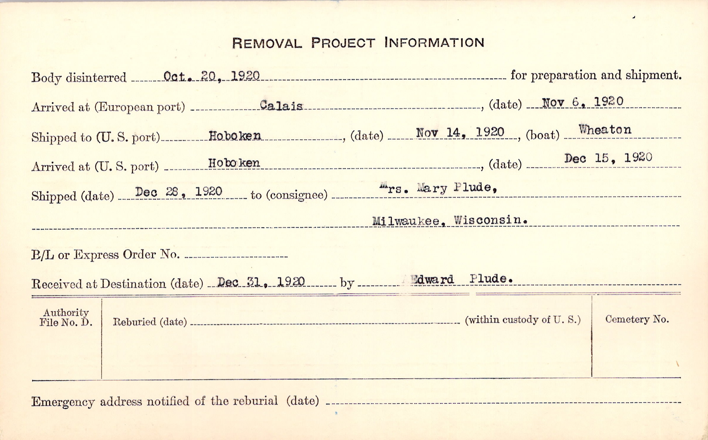 Body disinterred 10/20/1920 for preparation and shipment.