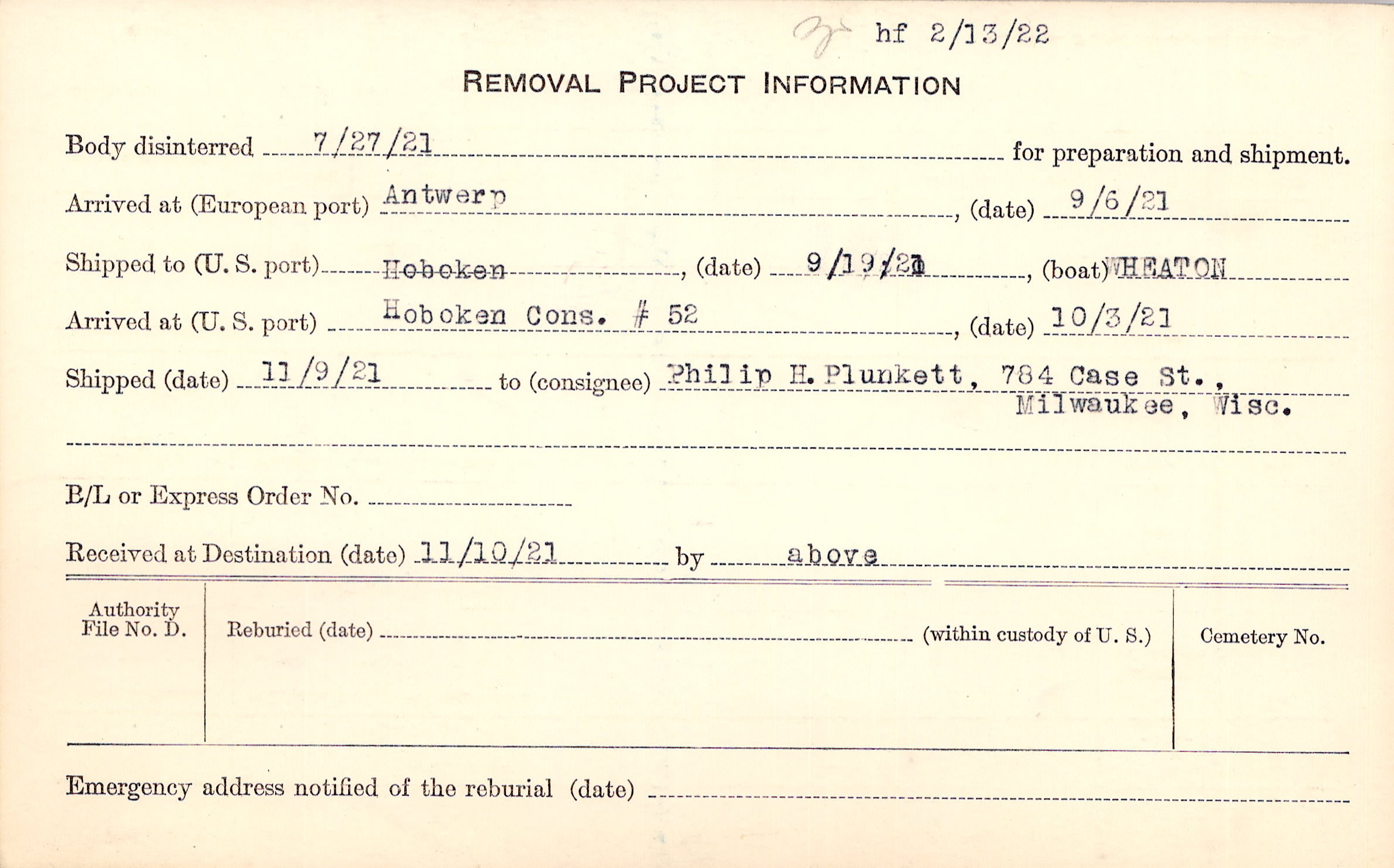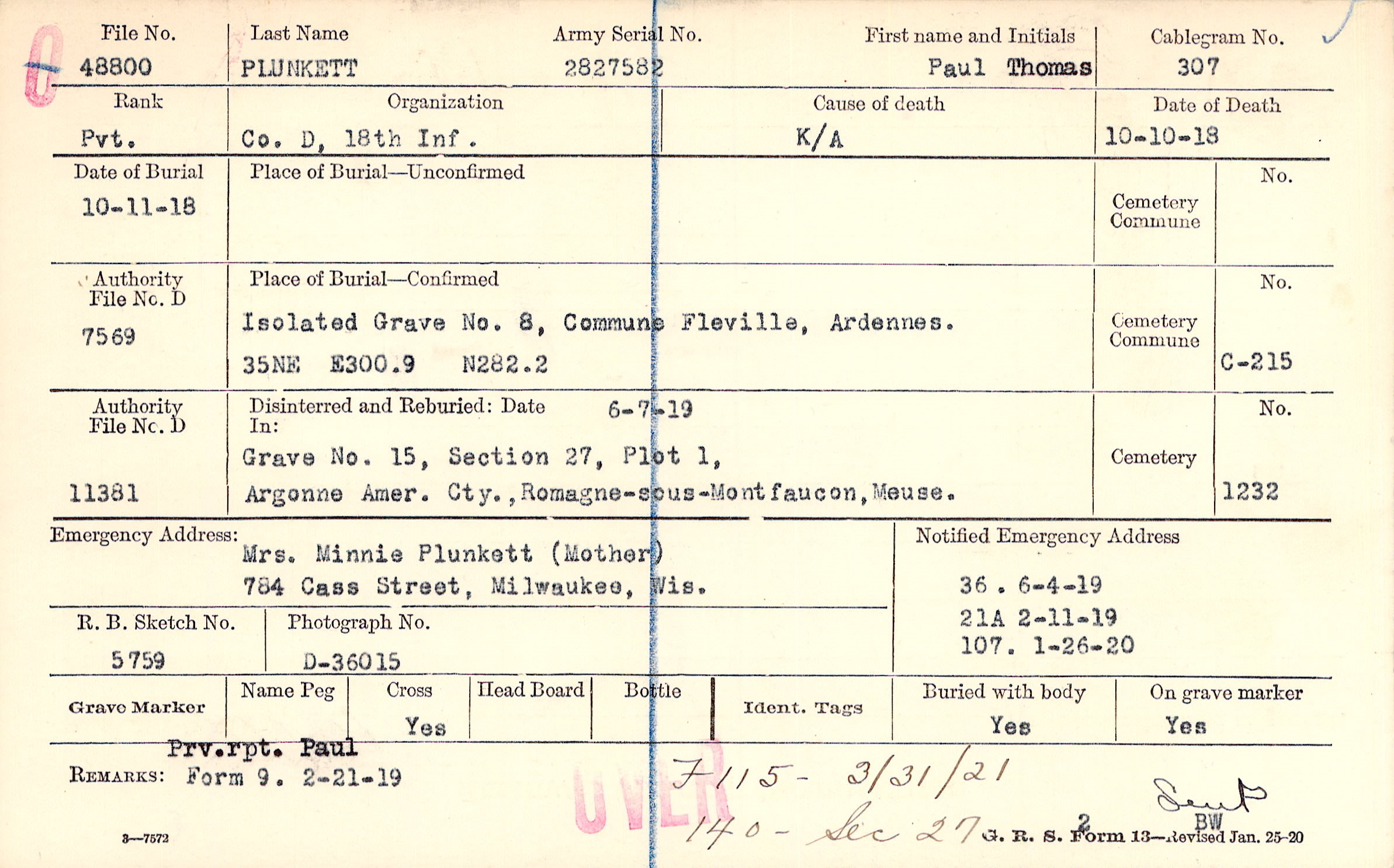 Mrs. Minnie Plunkett (Mother), 784 Cass Street, Milwaukee, Wis.