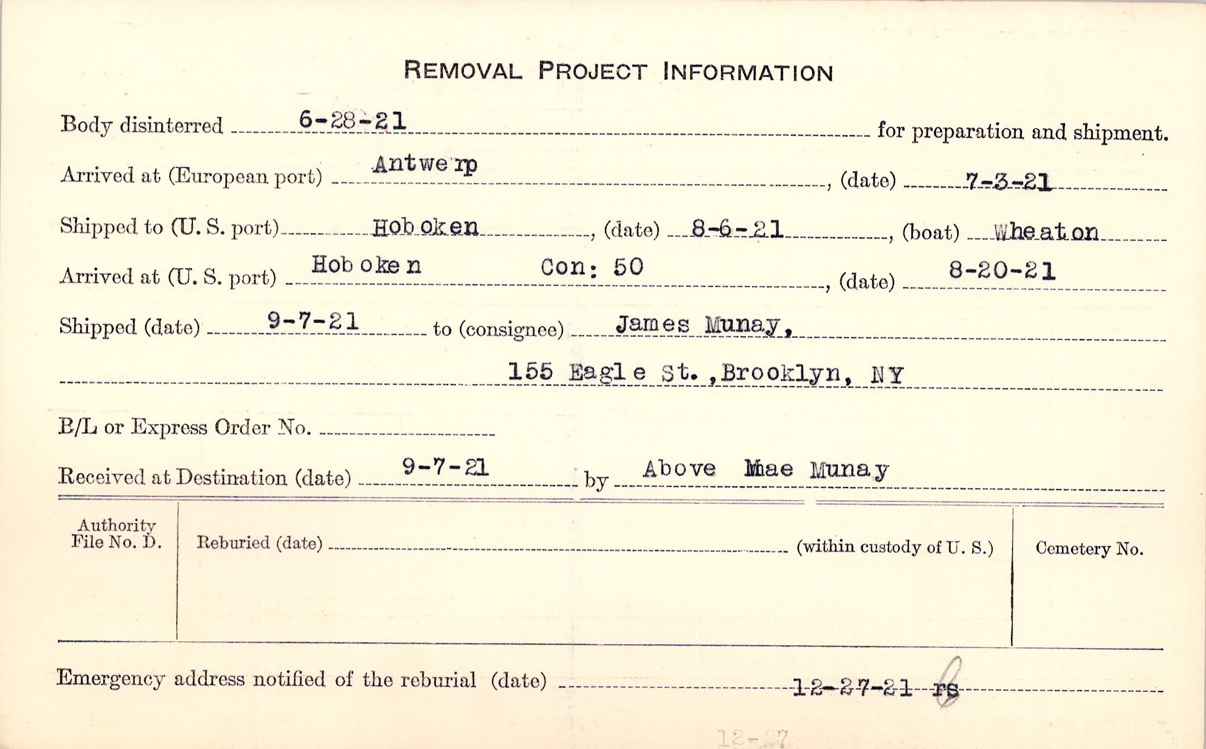 Body disinterred 6/28/1921 for preparation and shipment.