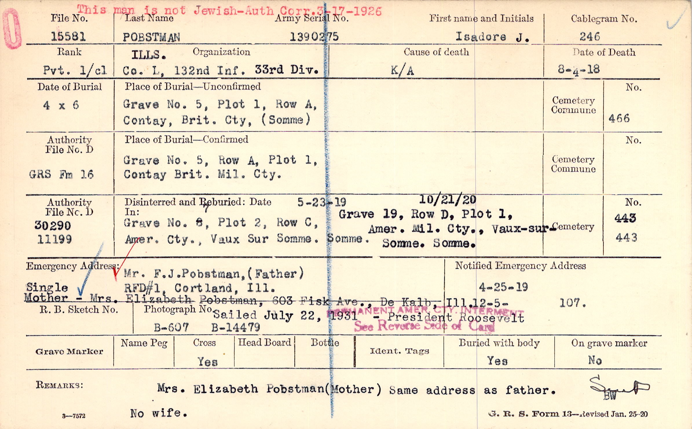 Mr. F.J.Pobstman,(Father), RFD#1, Cortland, Ill., Single Mother - Mrs. Elizabeth Pobstman, 603 Fisk Ave., De Kalb, Ill. Sailed July 22, 1931 - President Roosevelt.