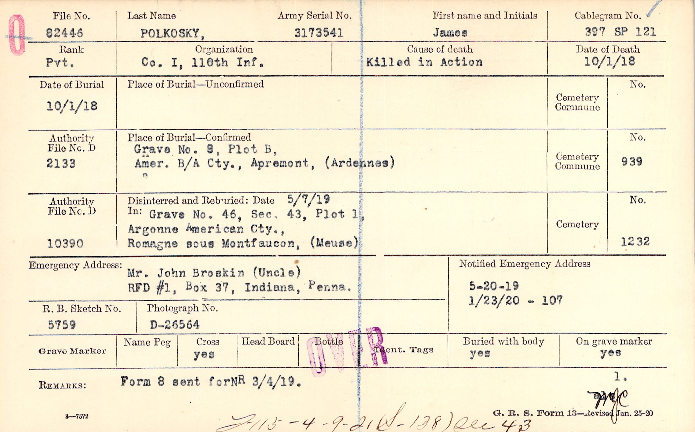 Grave 8, Plot B, Amer. B/A Cty., Apremont, Ardennes